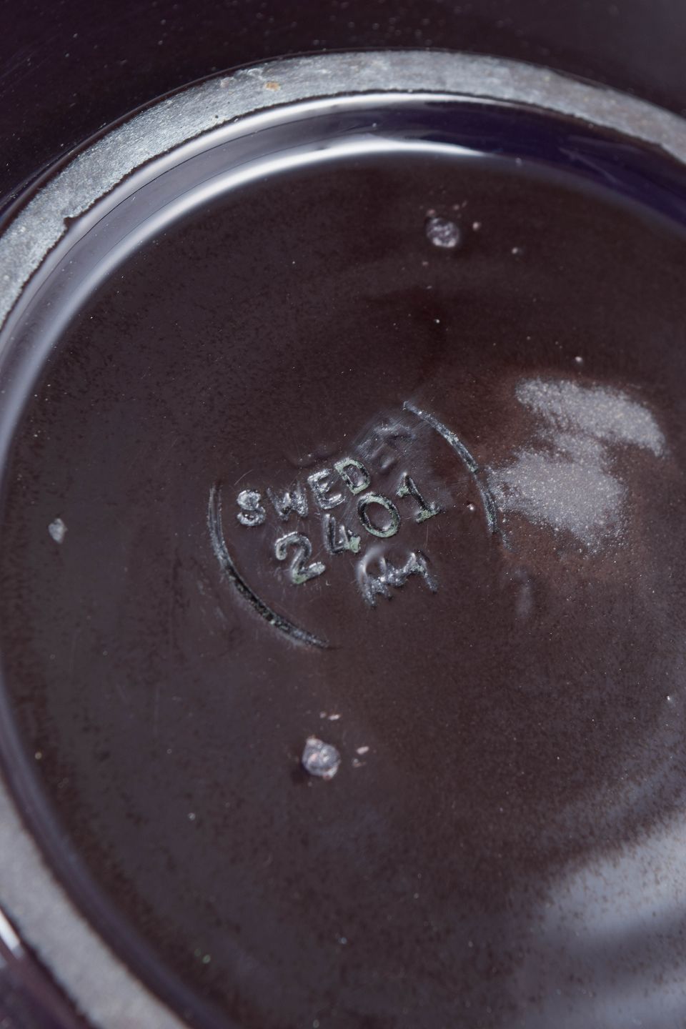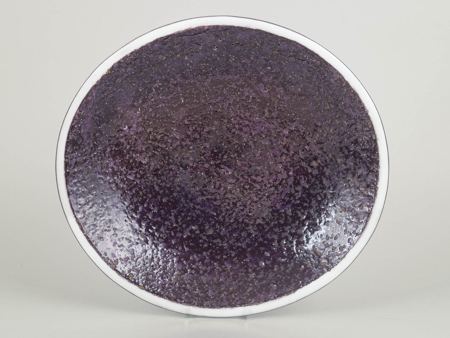 Large stoneware dish model 2401 with a characteristic thick glaze in deep purple tones and a slightly cratered textured surface.
