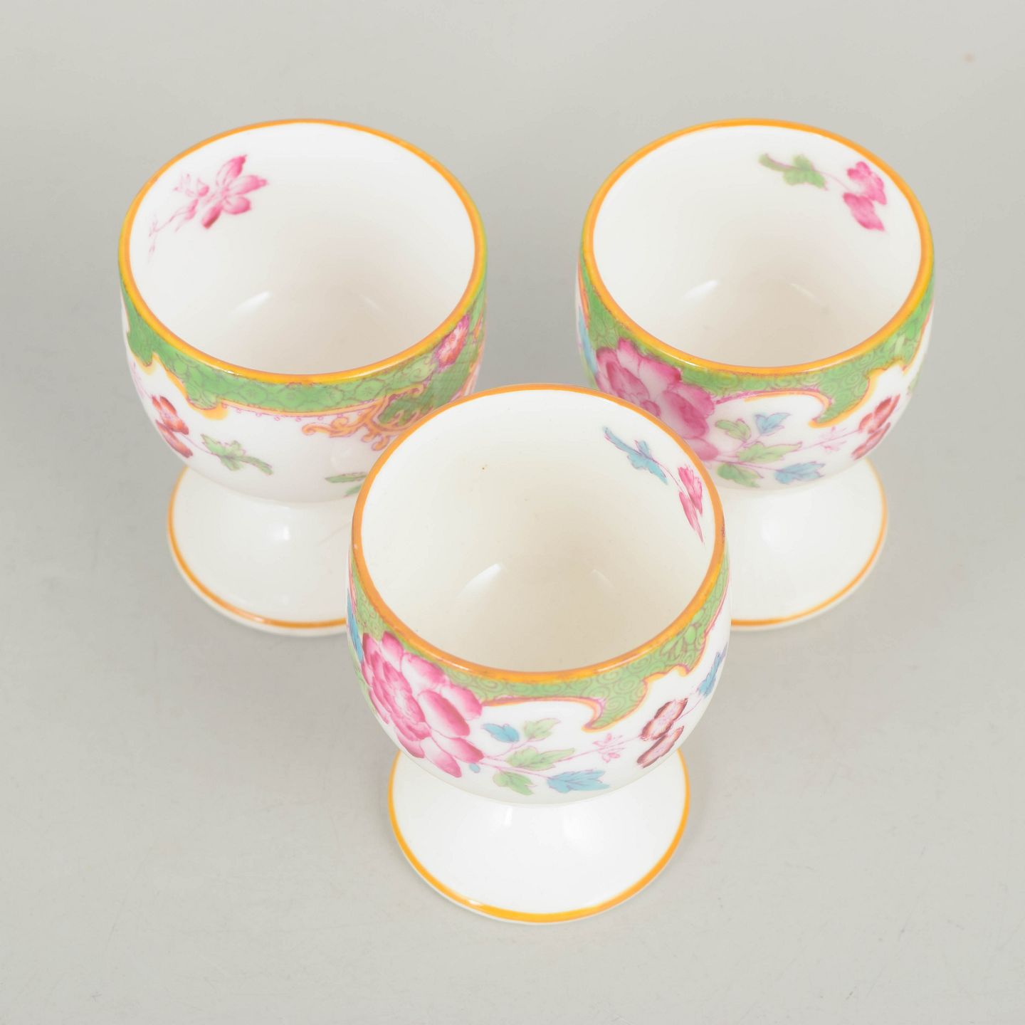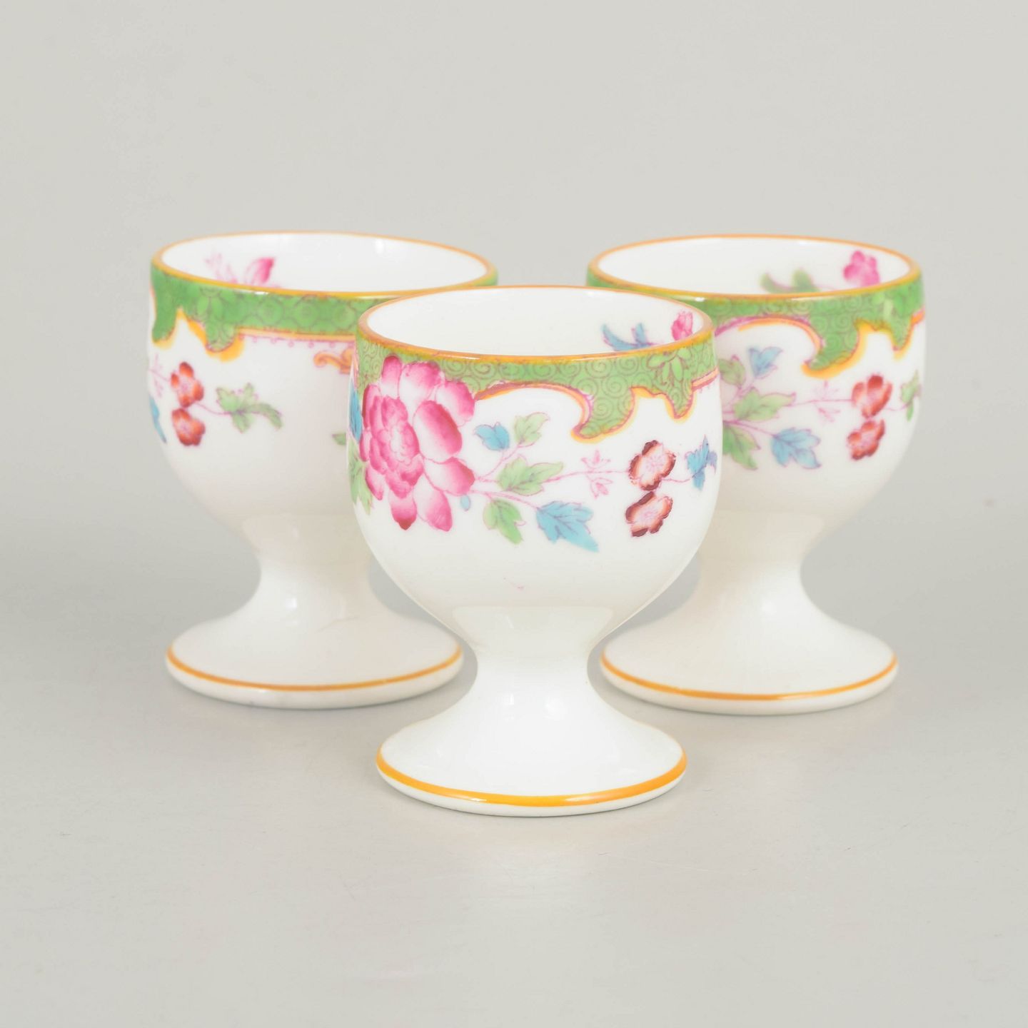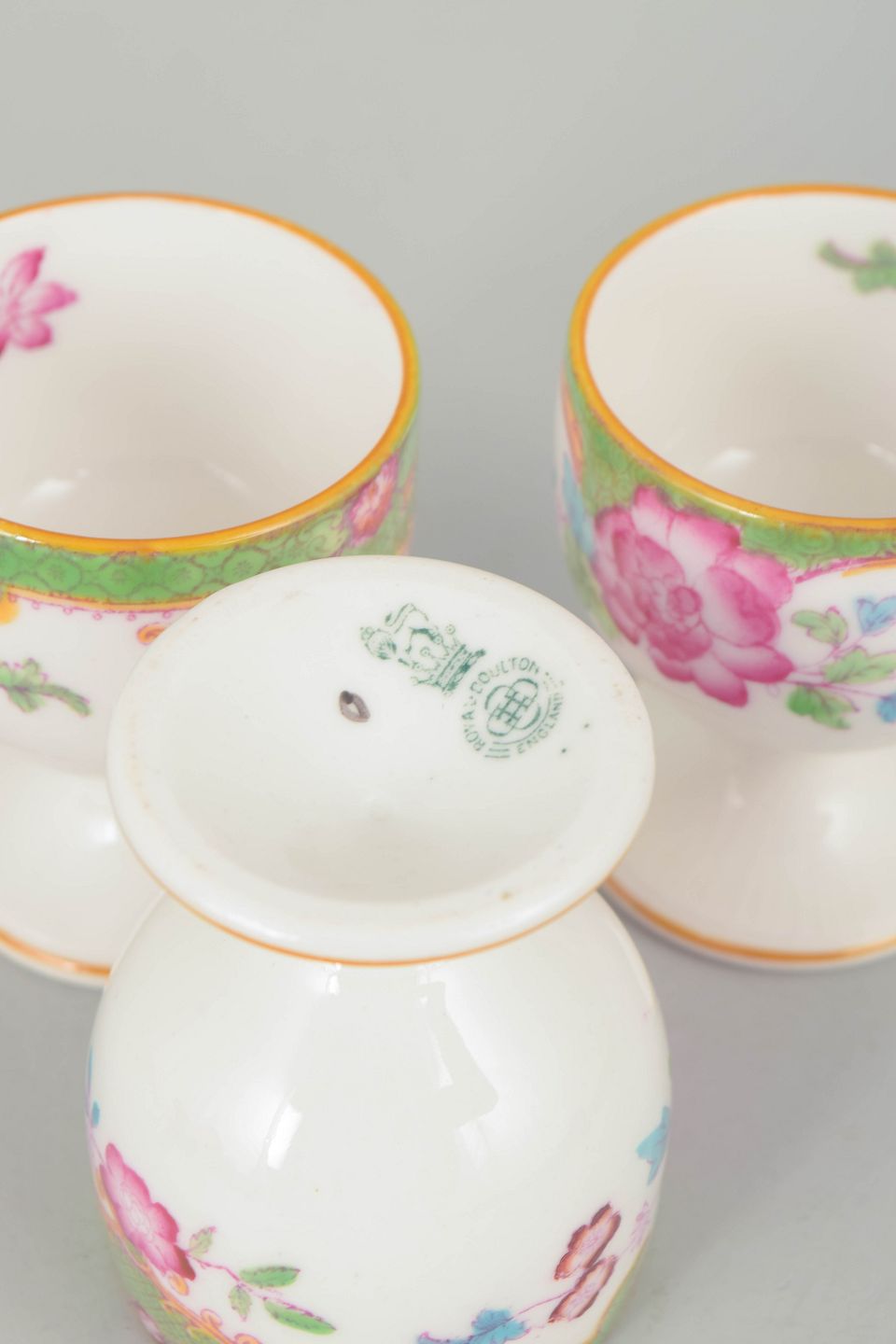 Royal Doulton Temple series set of three egg cups.Decorative porcelain egg cups with colourful floral decoration in the Temple pattern and characteristic green border.