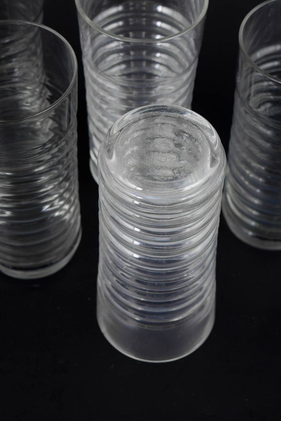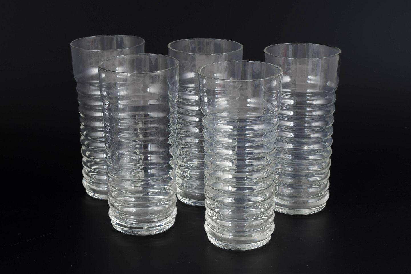 Nanny Still for Riihimäen Lasi, set of five drinking glasses.Clear glass from the Perpetum Mobile series with a distinctive ribbed structure and cylindrical form.