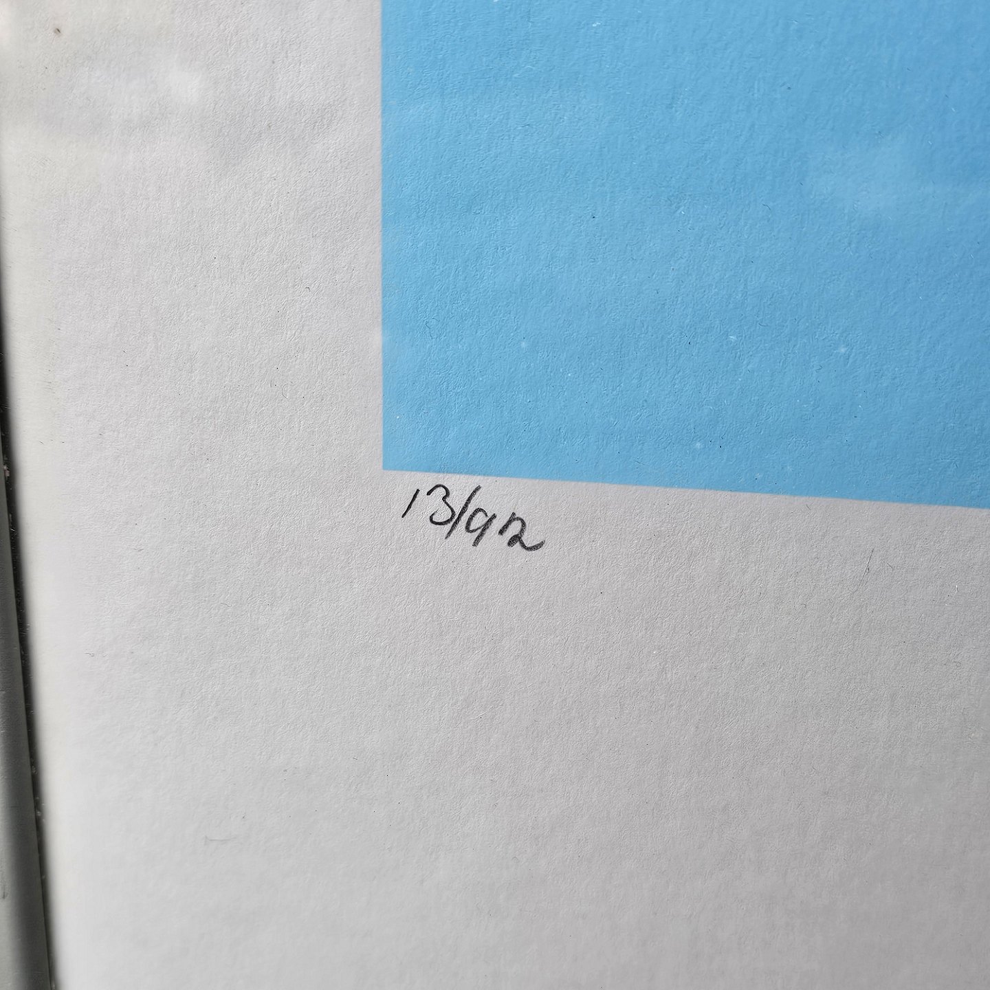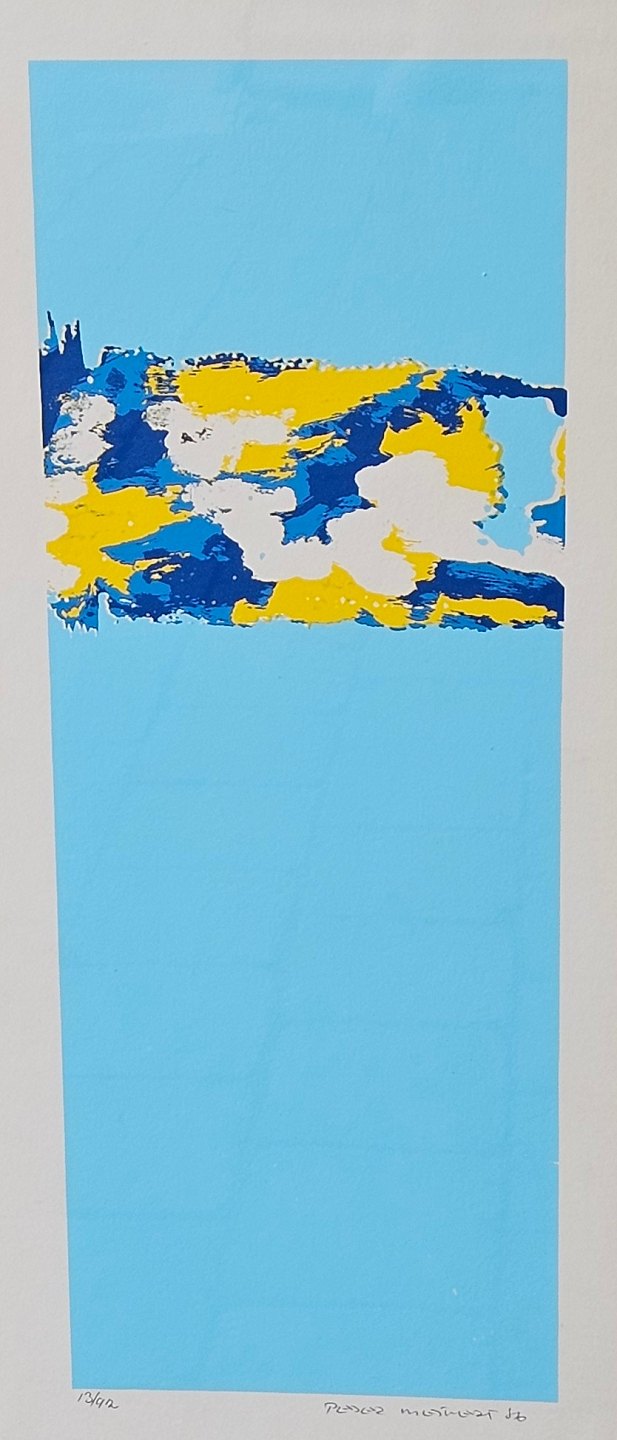 Litografi med blå, hvide og gule farver på lyseblå baggrund i metal ramme. 13/92Signeret Peder Meinert 16