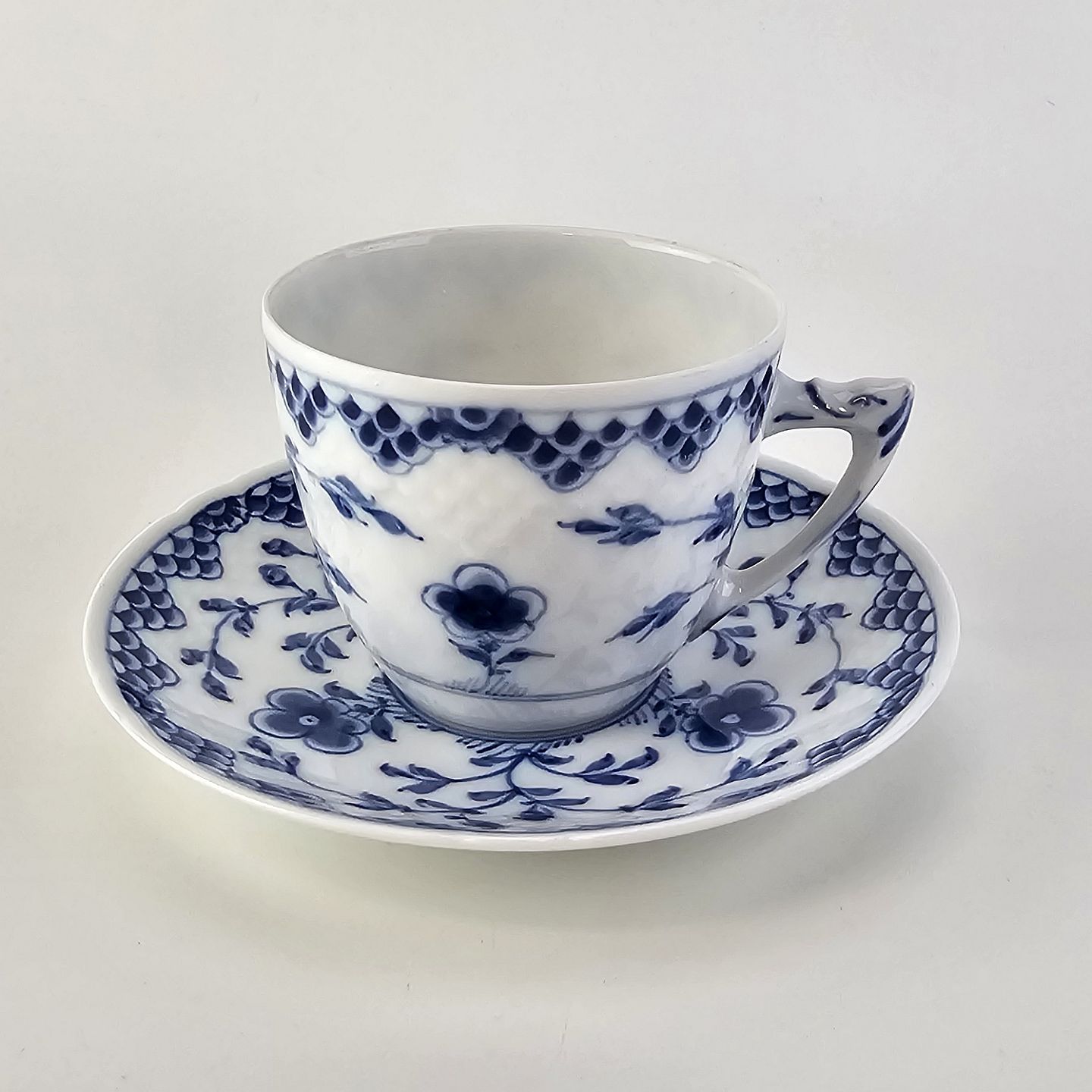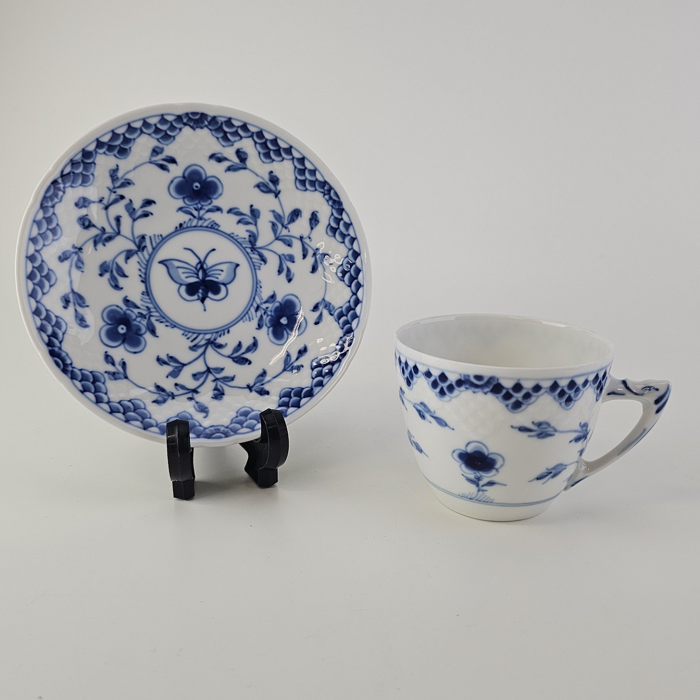 Kaffekop med underkop i porcelæn fra stellet Dickens Sommerfugl, kan indeholde 1,25 dl. Nr. 102
