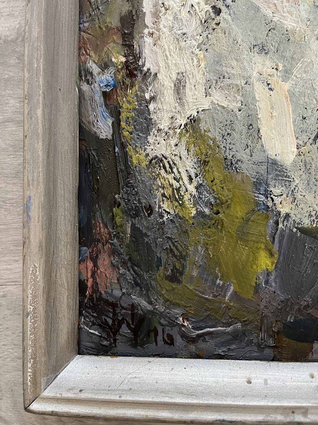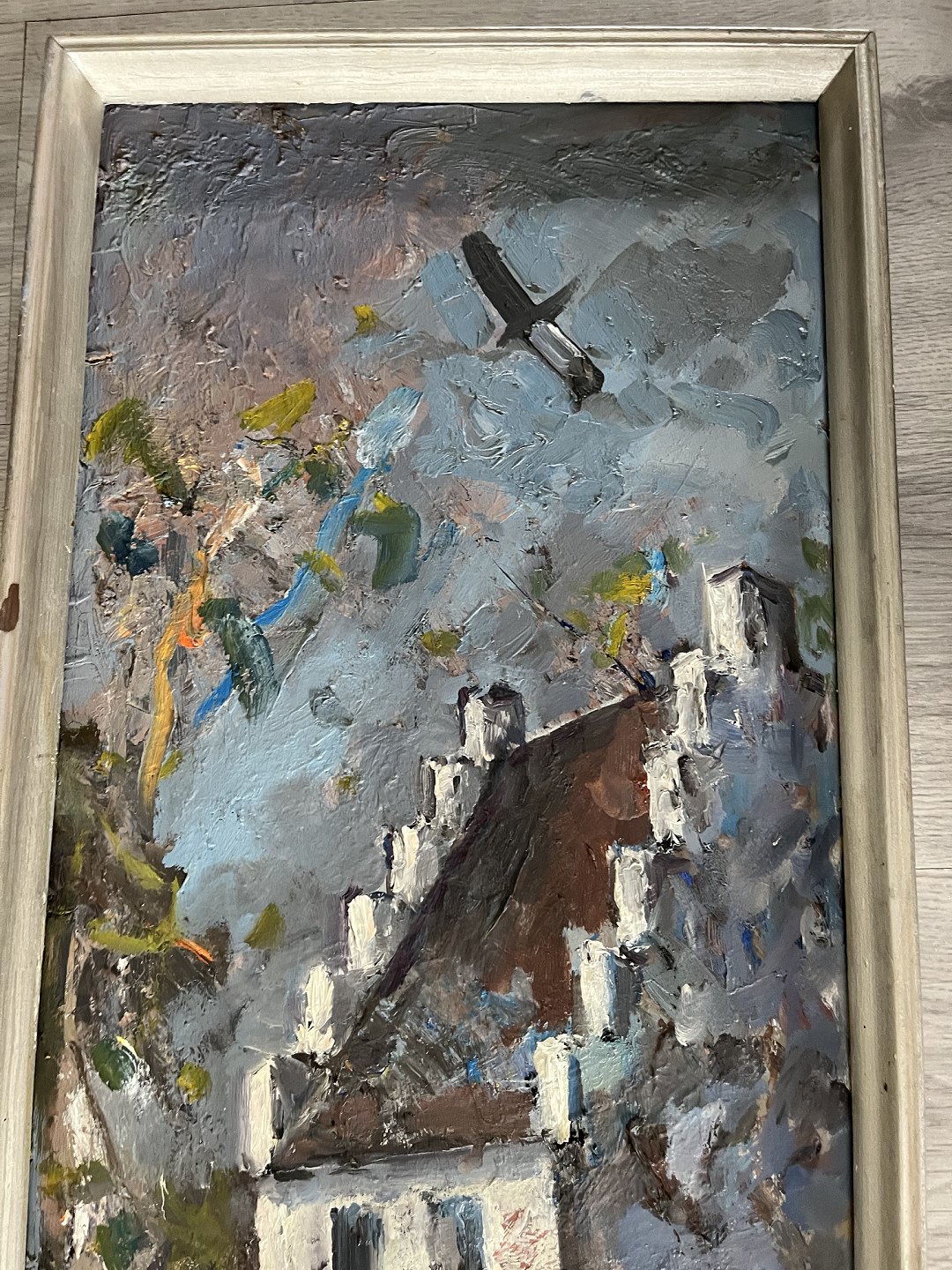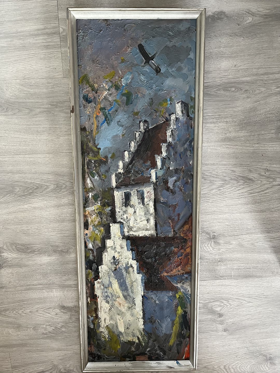 Maleri af William Hansen - Kirke i landskab med flyvende fugle 1976 (?)