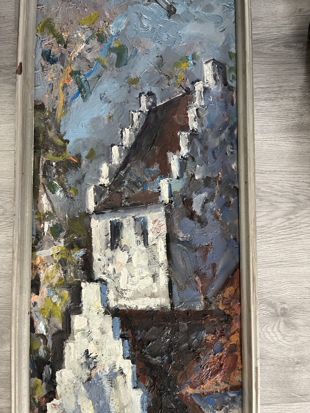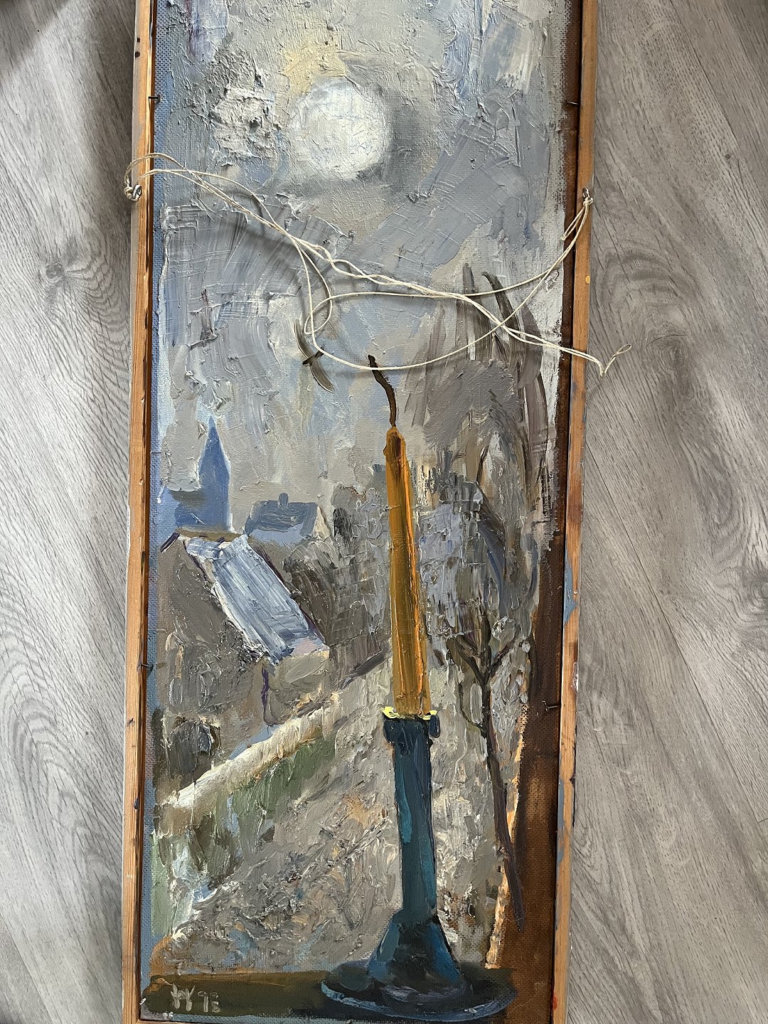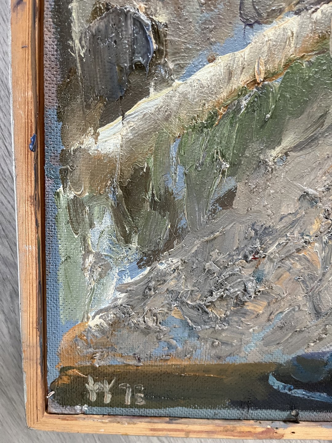 Maleri af William Hansen - Kirke i landskab med flyvende fugle 1976 (?)