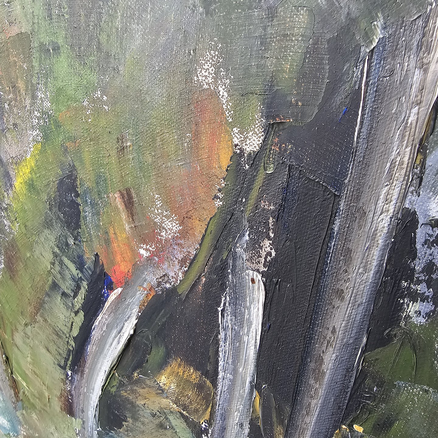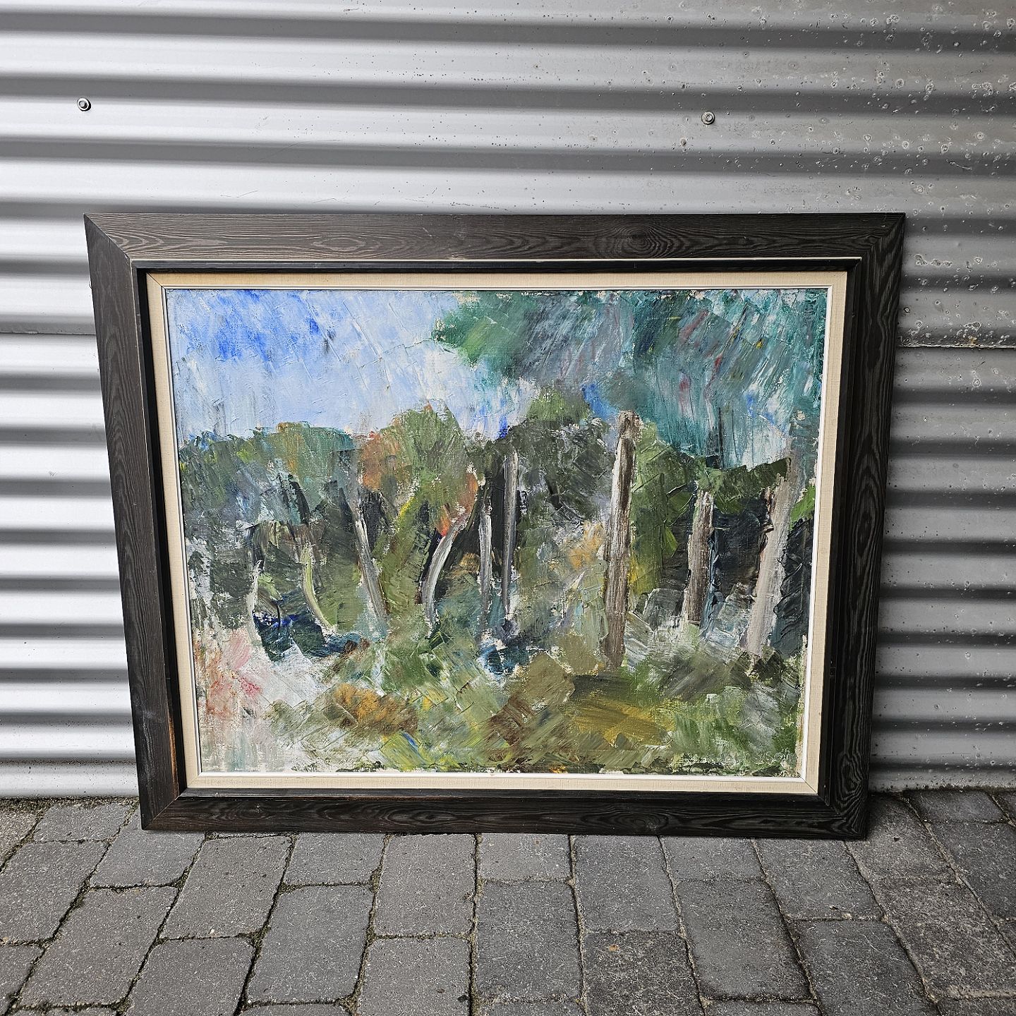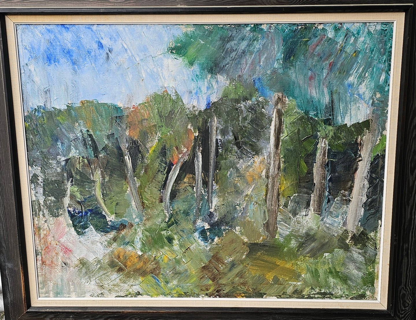Oliemaleri på lærred med titlen Tisvilde Hegn. Monteret i sortmalet ramme med abstrakt naturmotiv, dateret 1960Kunstner Knud Brisson (1928-2012)