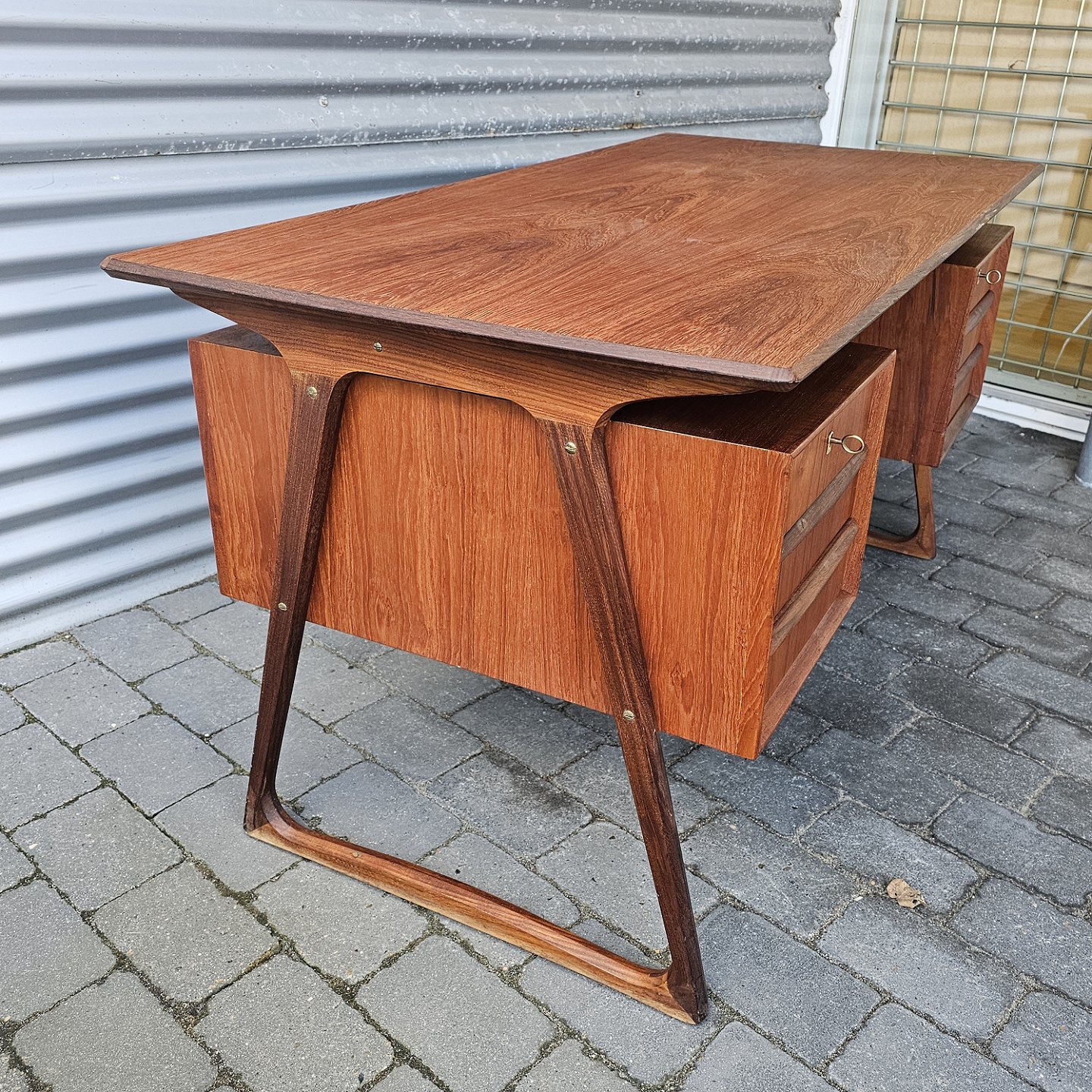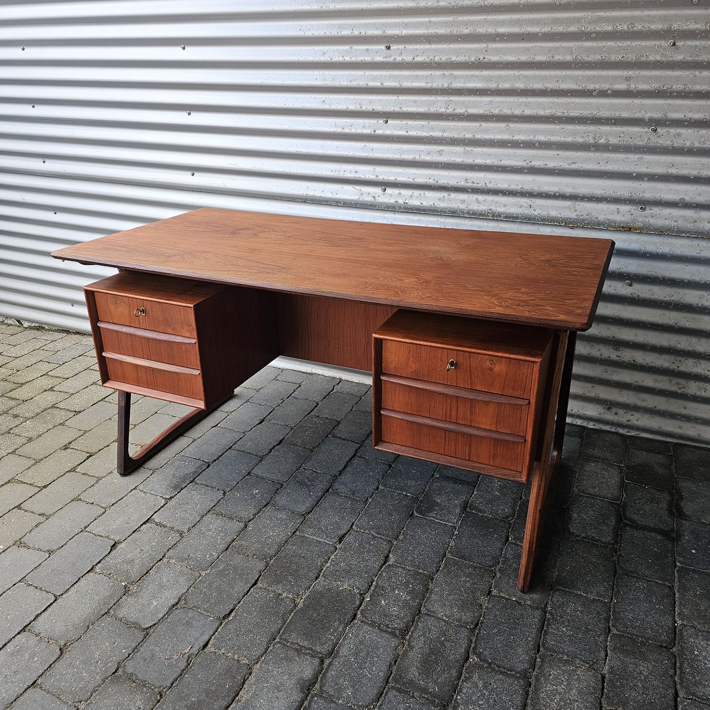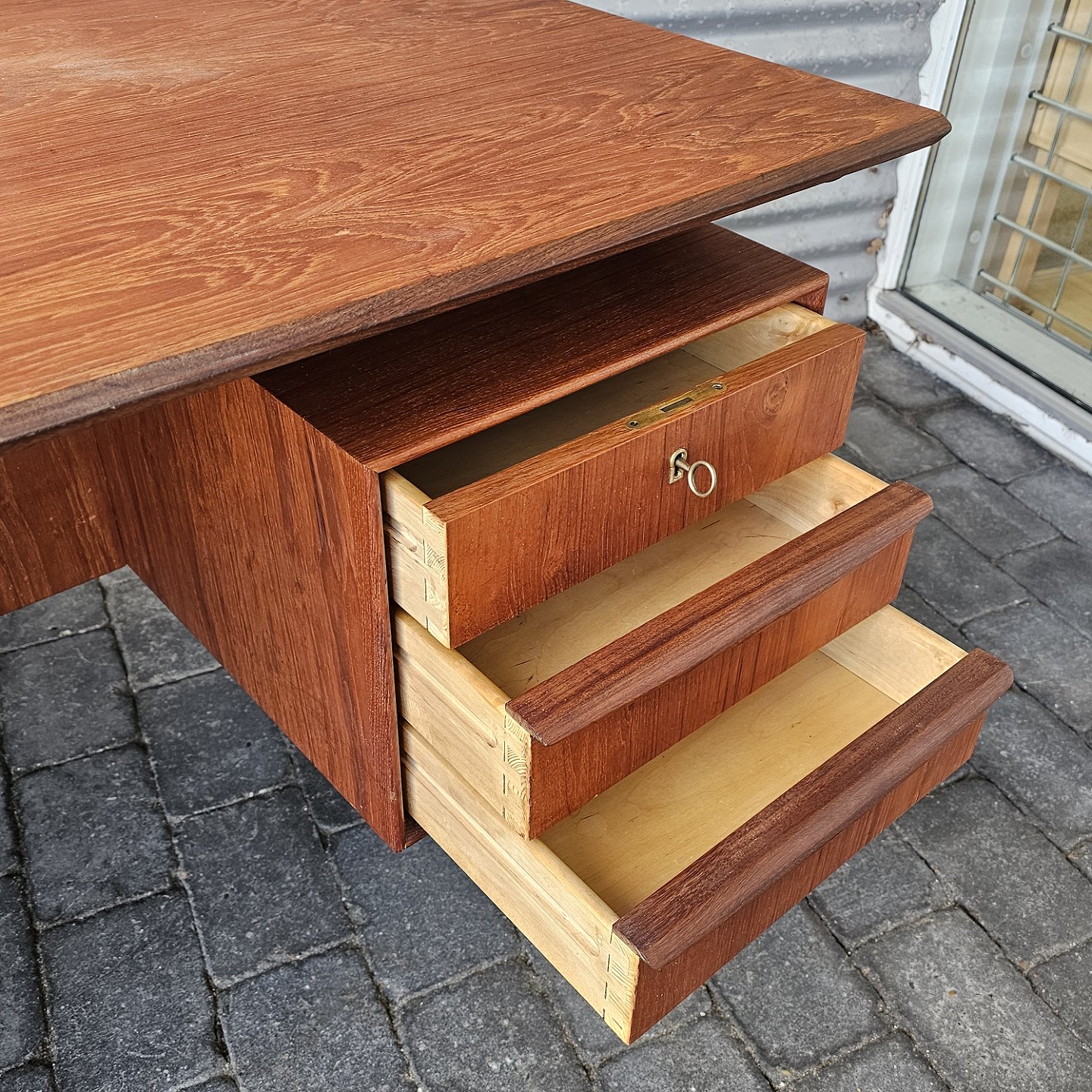Skrivebord i teaktræ med skuffer i begge sider, øverste skuffer med nøgleDesign Svend Aage Madsen