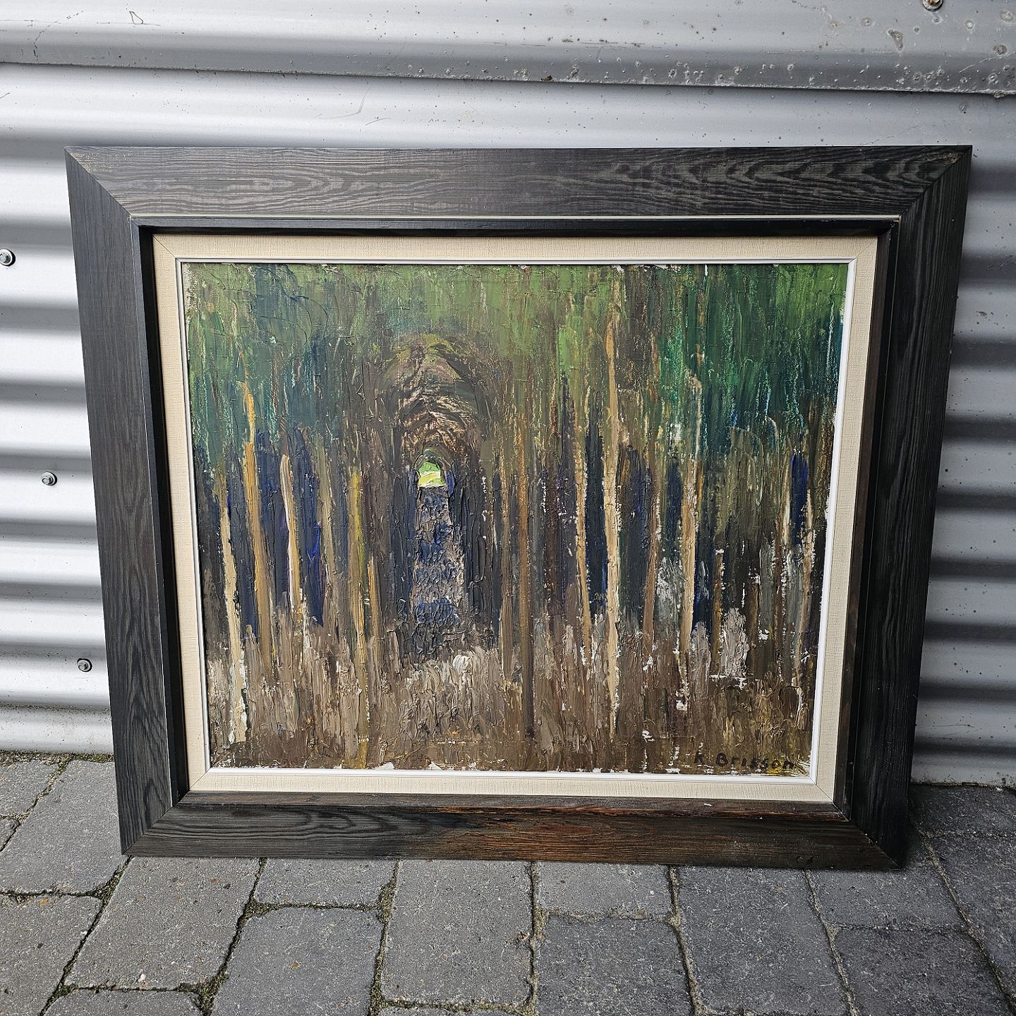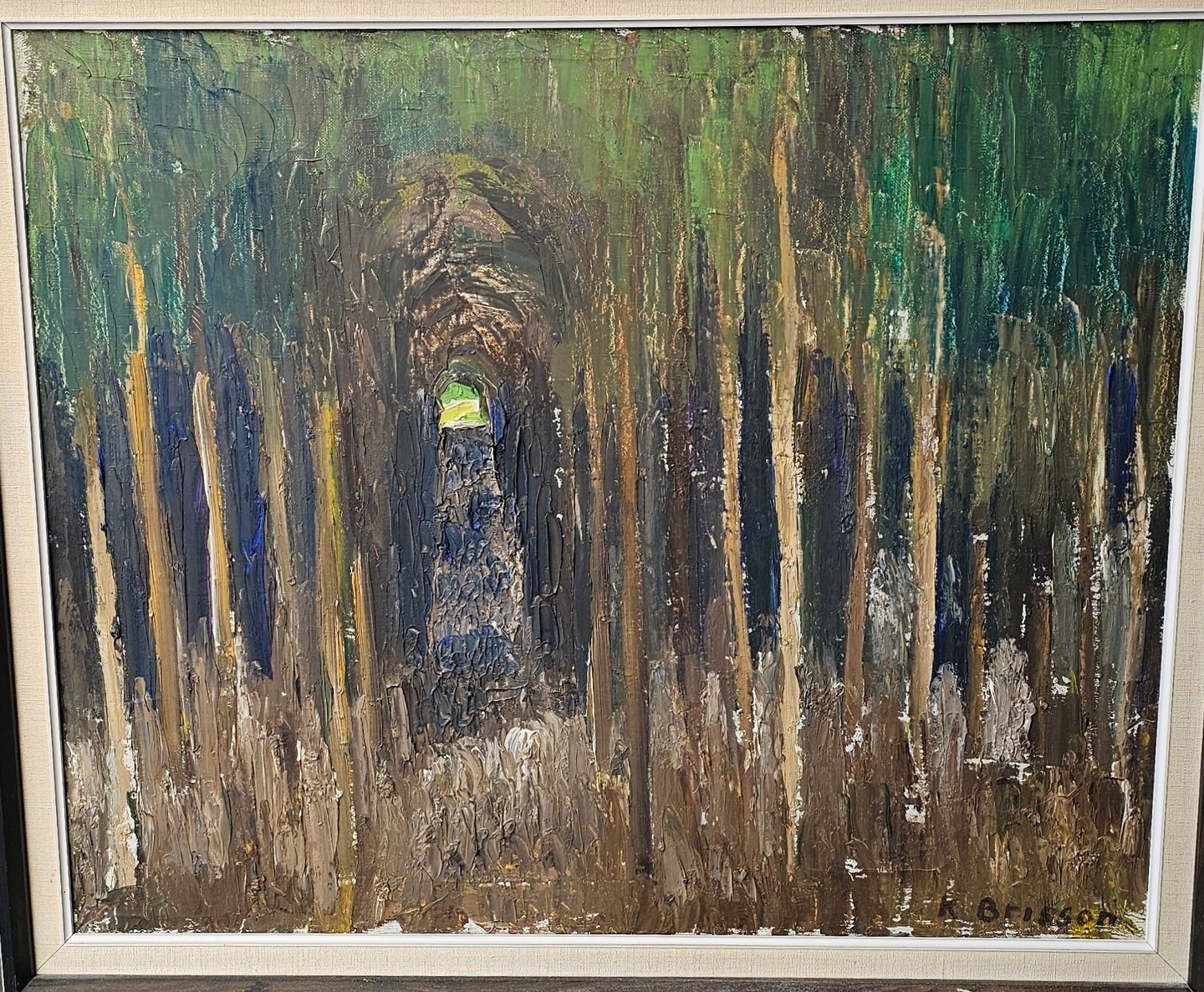 Oliemaleri på lærred med titlen Granskov. Monteret i sortmalet ramme med motiv af en sti gennem grantræer, dateret 1960Kunstner Knud Brisson (1928-2012)