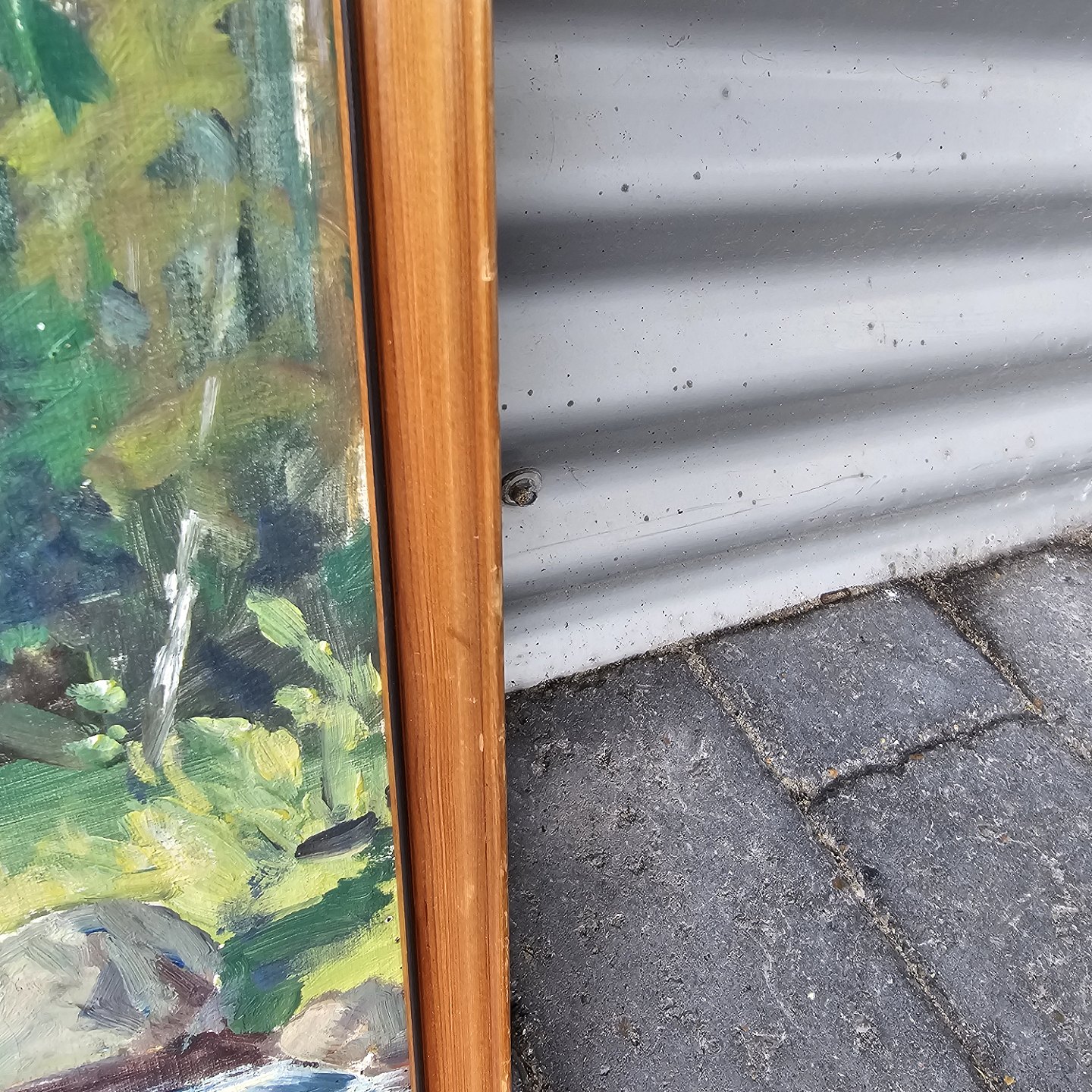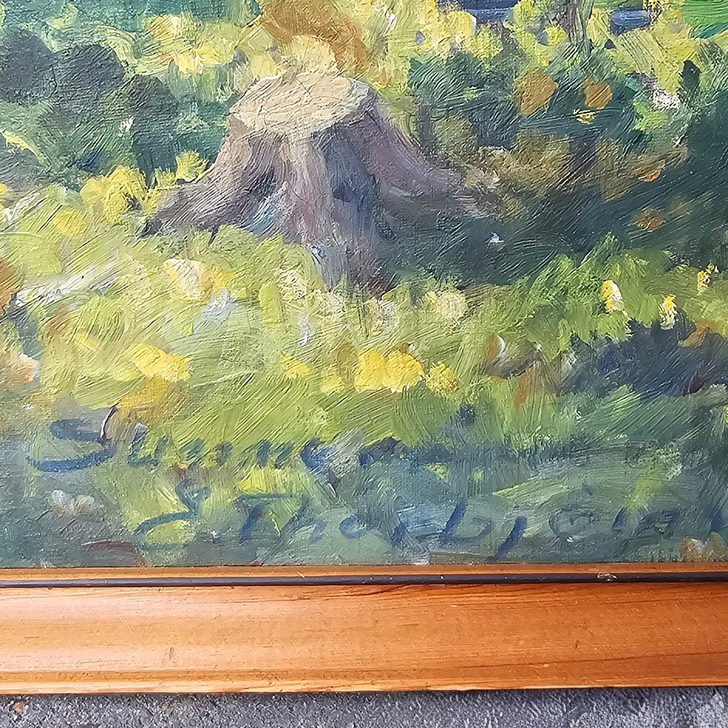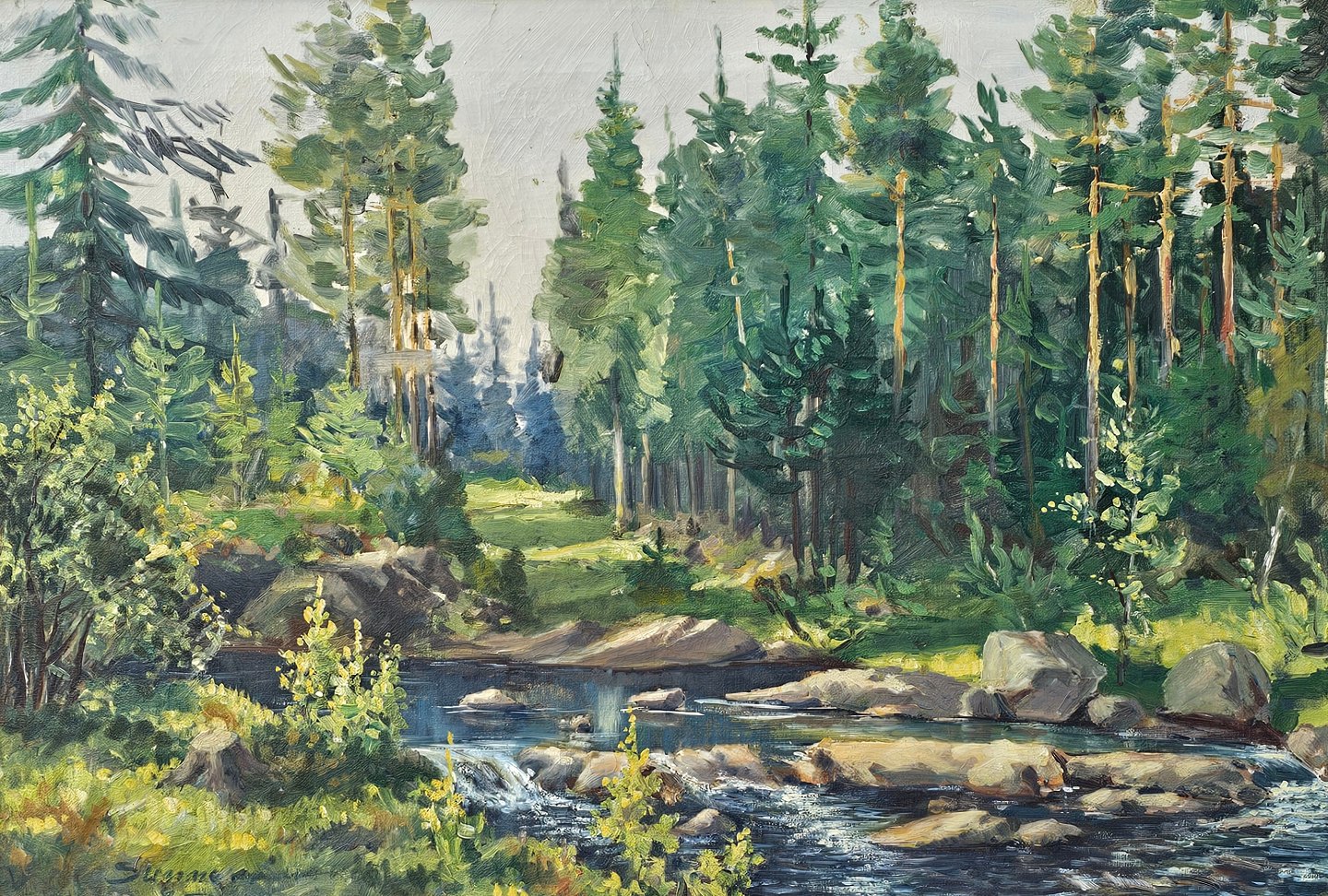 Oliemaleri på lærred med titlen Sommer. Monteret i træramme med motiv af et vandløb i en skovKunstner Evelyn Bøje Thorbjørn Andersen (1911-1990)