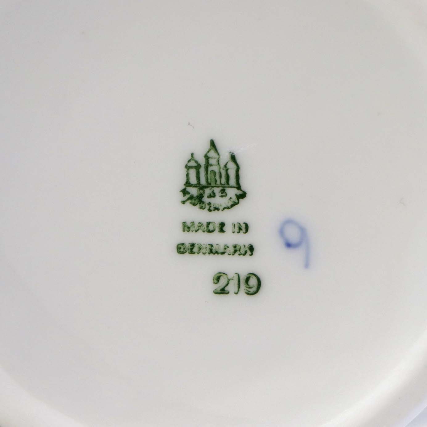Service i hvid porcelæn med skelform og dekoration af blå blomsterranker.