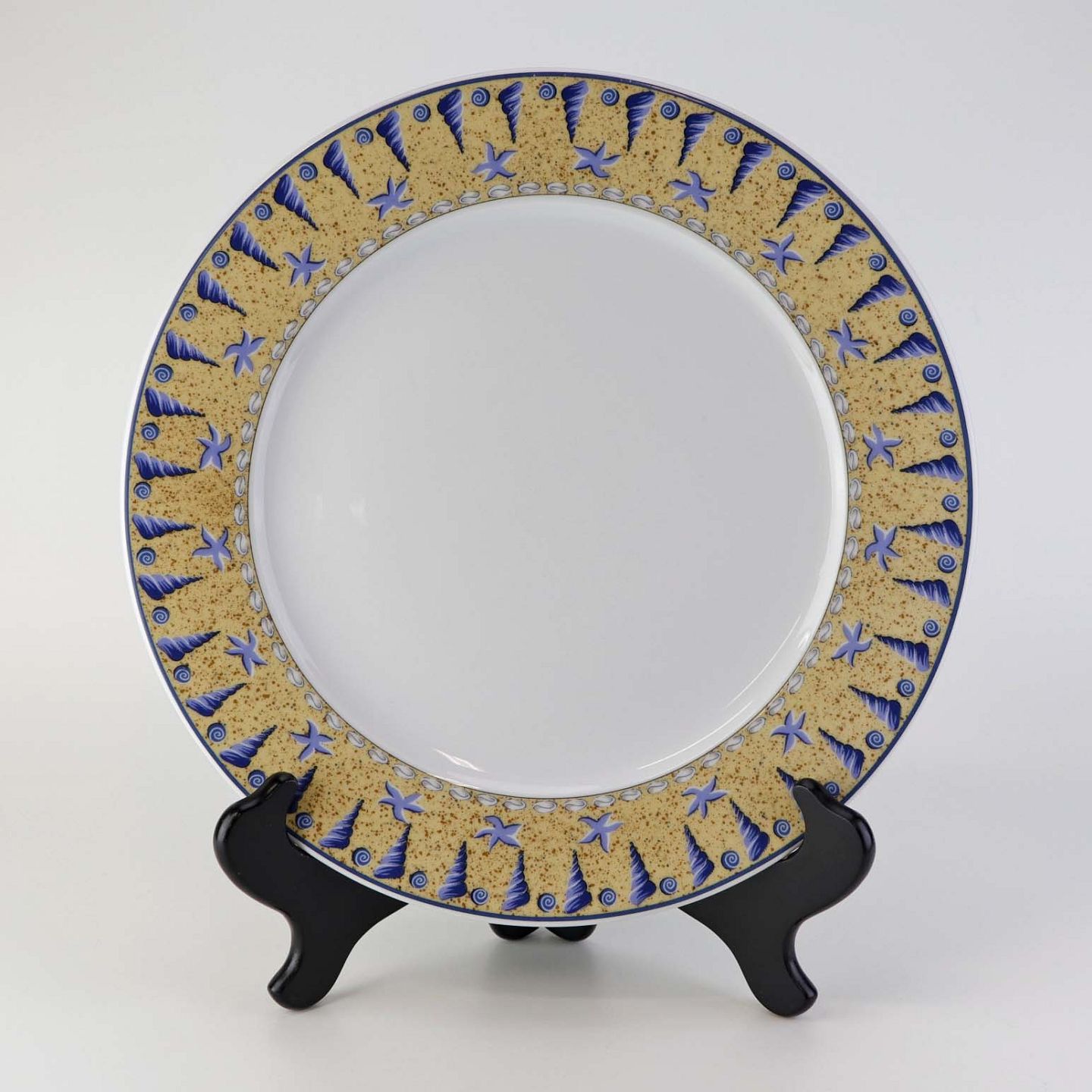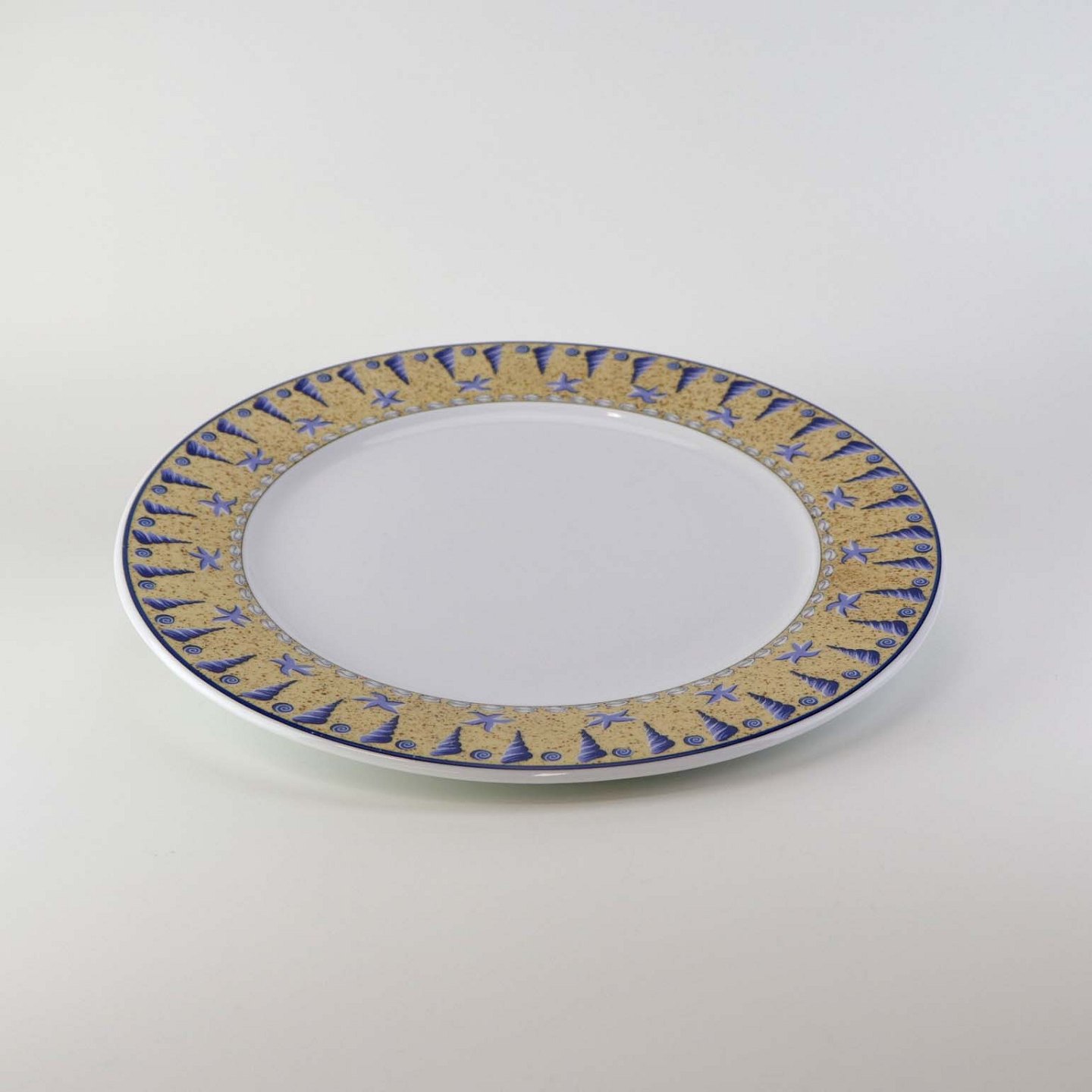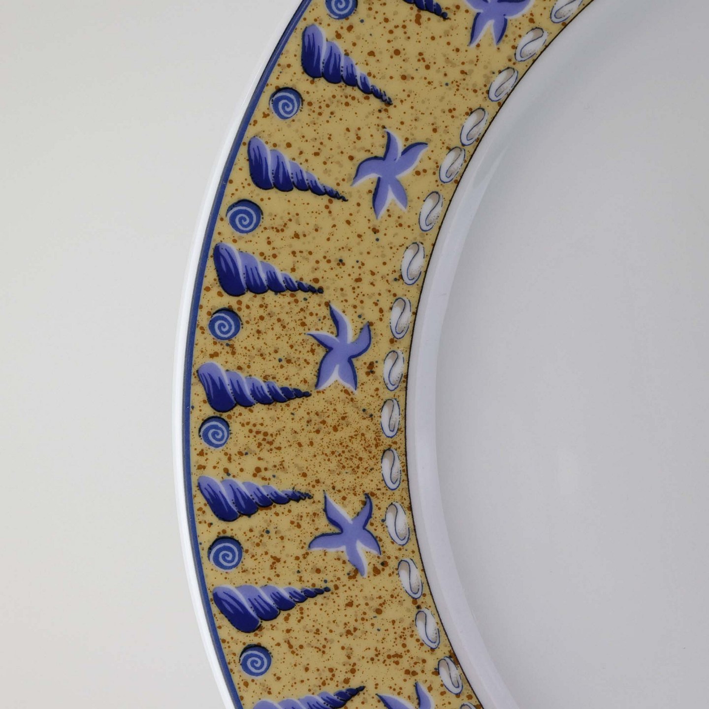 Service i glat hvid porcelæn med blåt bånd og dekoration af gule vifteformede strandskaller. På dækketallerknen er der gult bånd med blå strandskaller. Stellet kan gå i opvaskemaskinen.