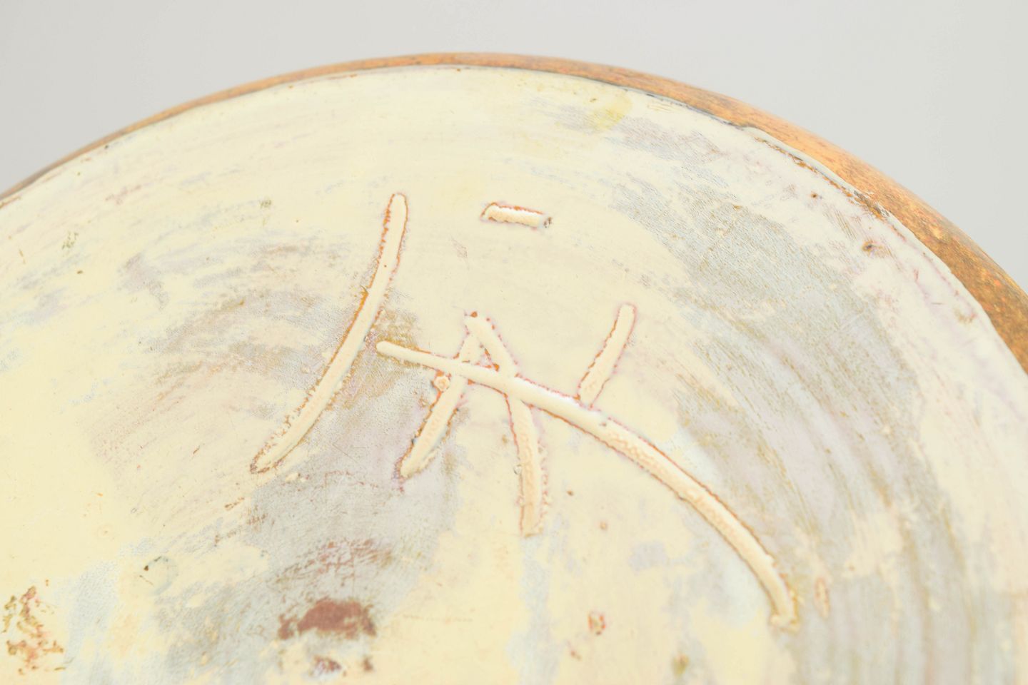 Decorative stoneware dish with characteristic spiral ornamentation and uranium glaze in golden and brown tones. A strong example of Hammershøi’s design language and experimental glaze work from the 1930s. Marked on the base.