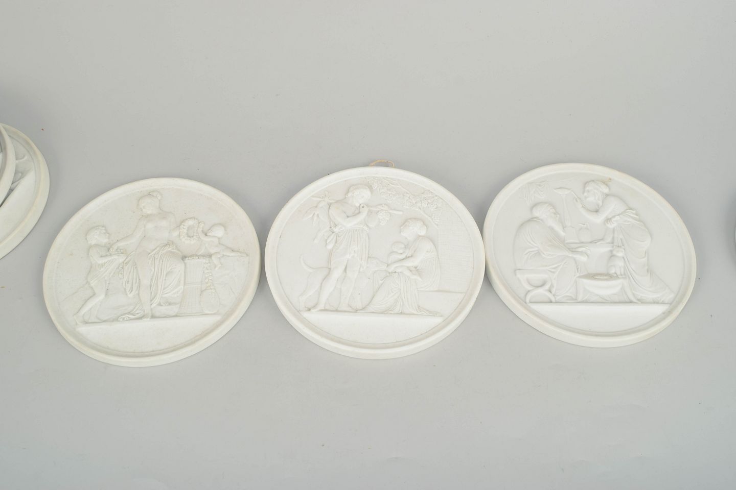 White unglazed porcelain reliefs with classical motifs after Bertel Thorvaldsen, executed in fine biscuit with detailed figural decoration and suspension mounts on the reverse. First factory quality.