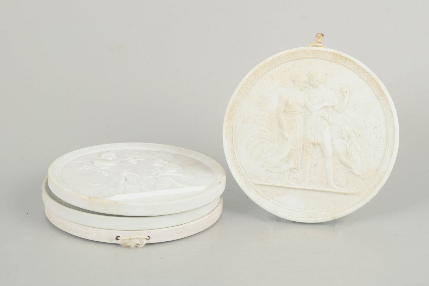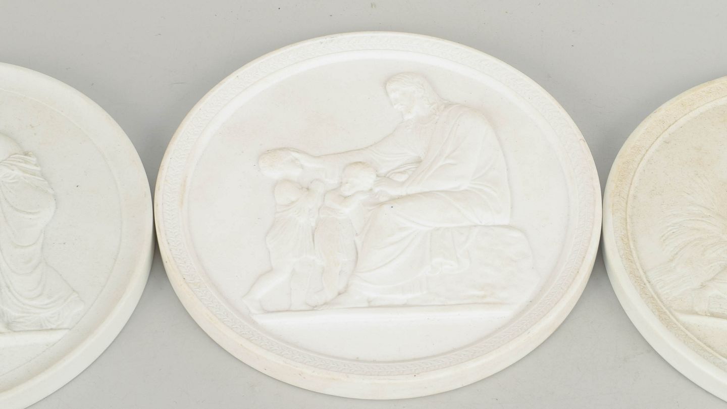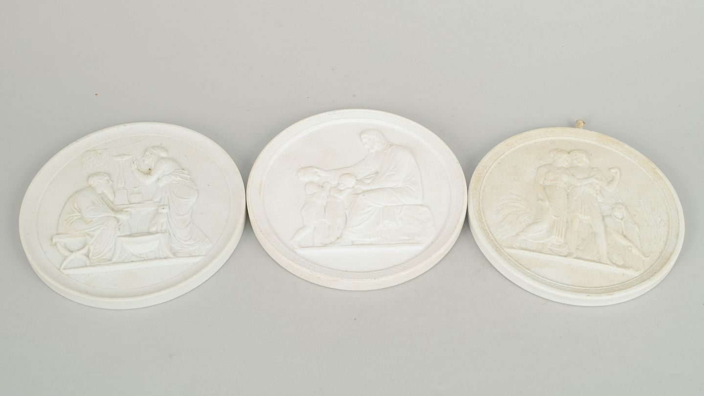 Royal Copenhagen, set of three biscuit wall plaques after Thorvaldsen.White unglazed porcelain reliefs with classical motifs after Bertel Thorvaldsen, executed in fine biscuit with detailed figural decoration and suspension mounts on the reverse. First and third factory quality.