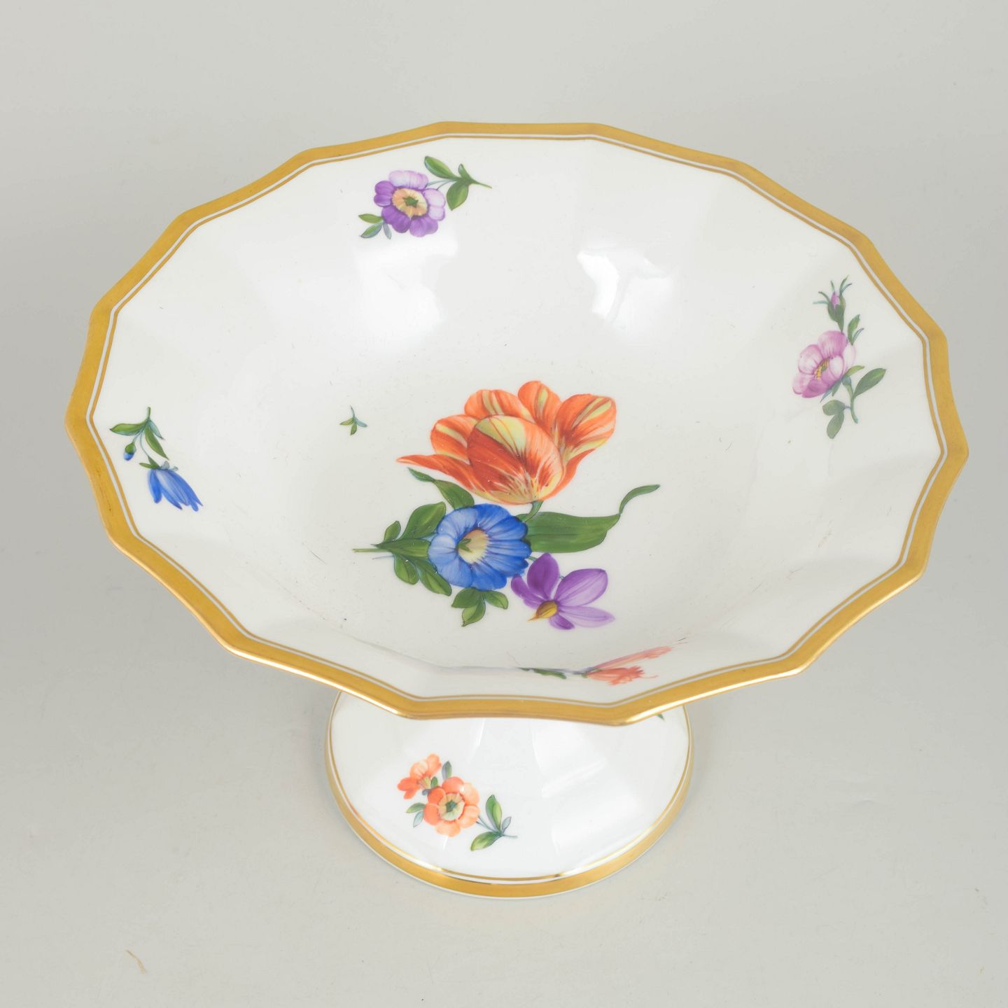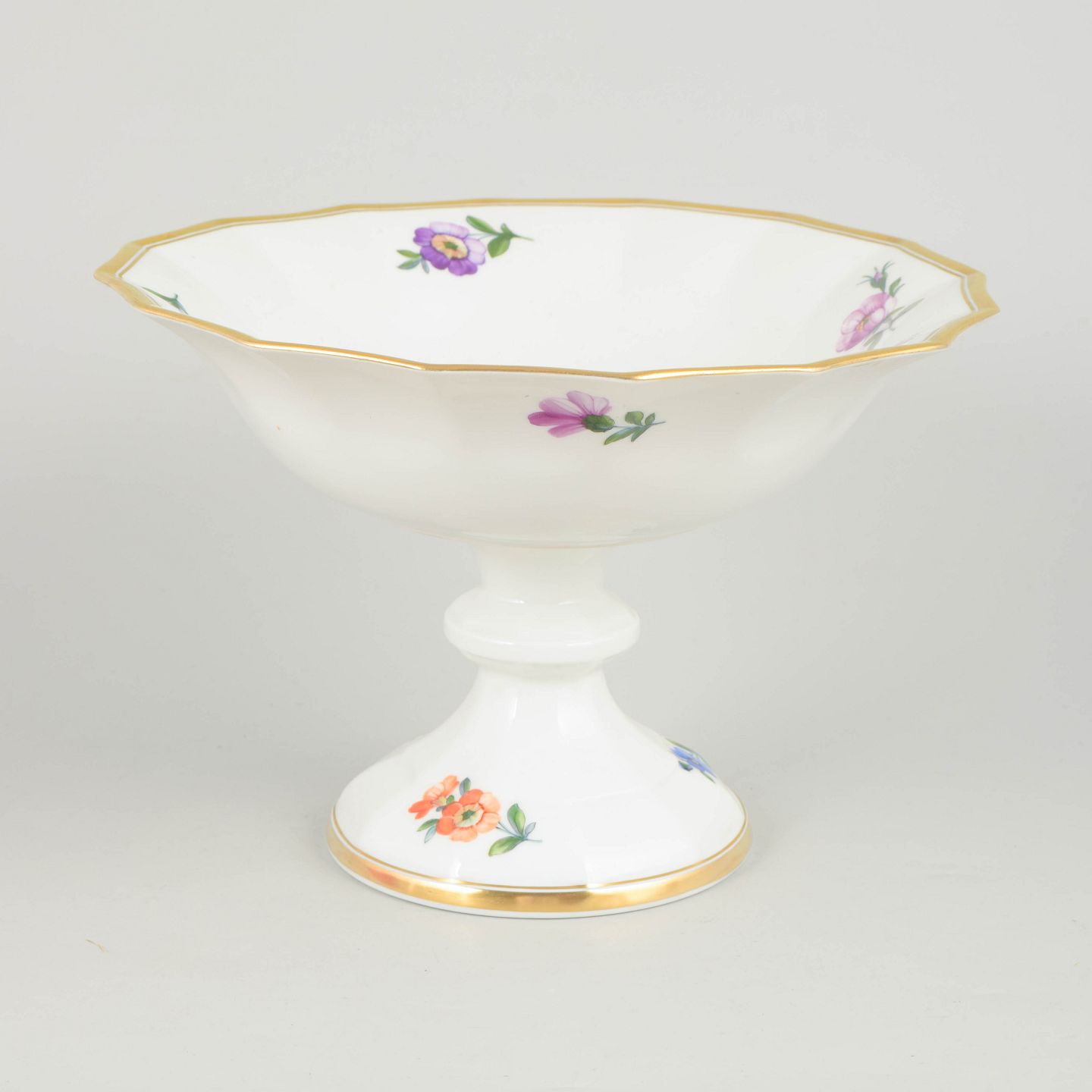 Elegant porcelain compote decorated with hand-painted floral motifs in the Saxon Flower pattern. Produced in first factory quality with a classic elevated form and balanced proportions, model 627/8531, dated 1961.