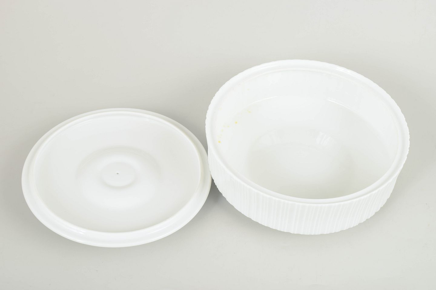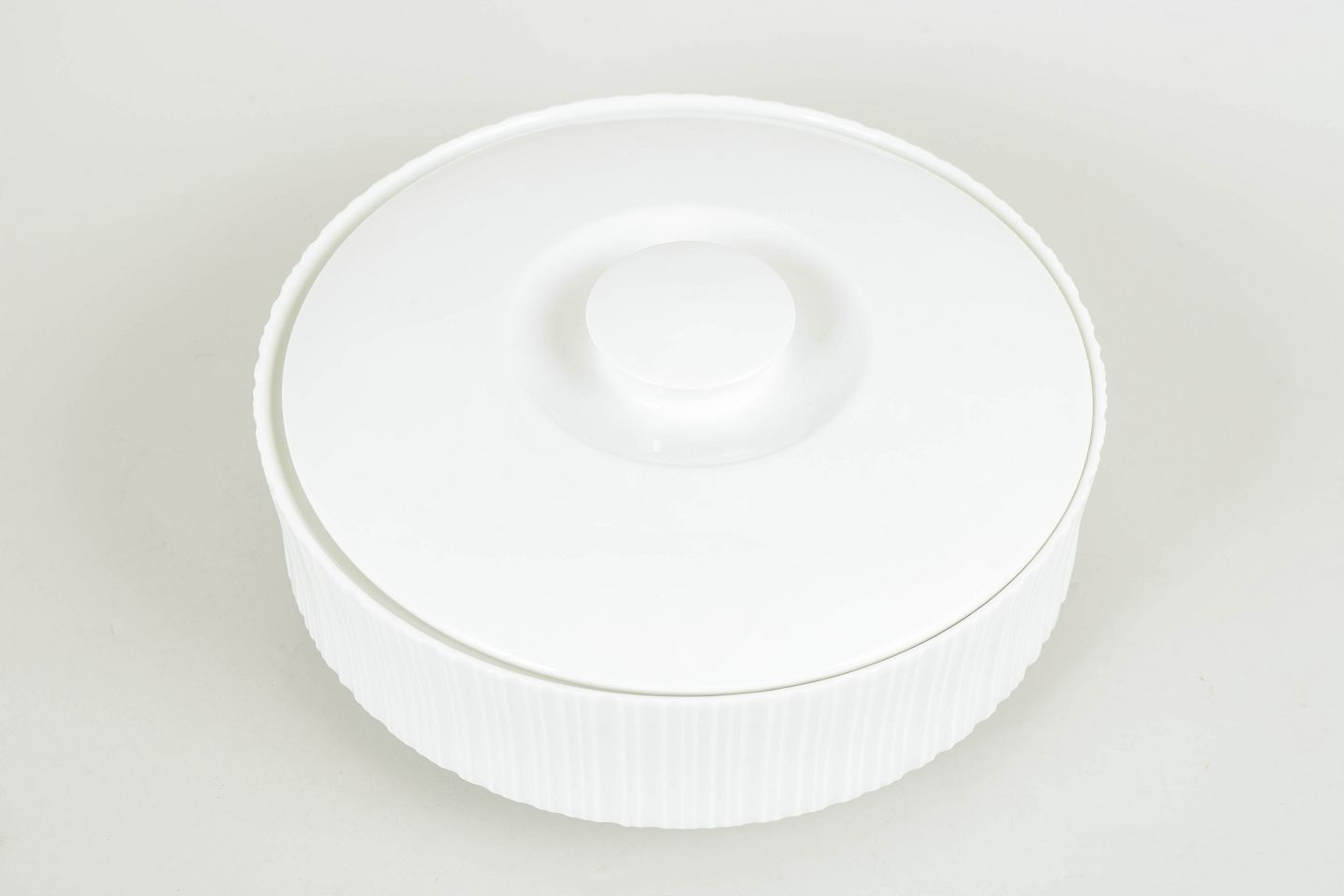 Round porcelain lidded bowl with vertical fluting and a clean functionalist design, characteristic of Tapio Wirkkala’s work for Rosenthal in the 1980s.