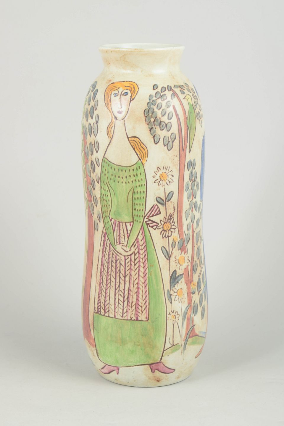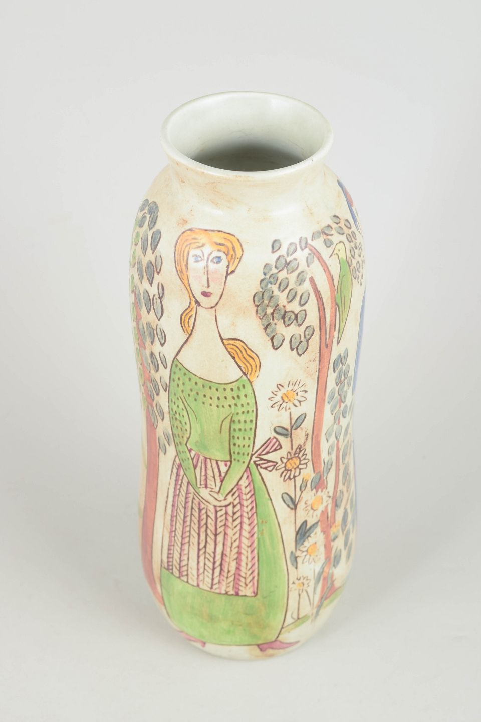 Carl-Harry Stålhane for Rörstrand, hand-painted vase.Slender stoneware vase with hand-painted figurative decoration in green, red and earthy tones, executed in a characteristic artistic style reflecting mid twentieth century Scandinavian ceramics.