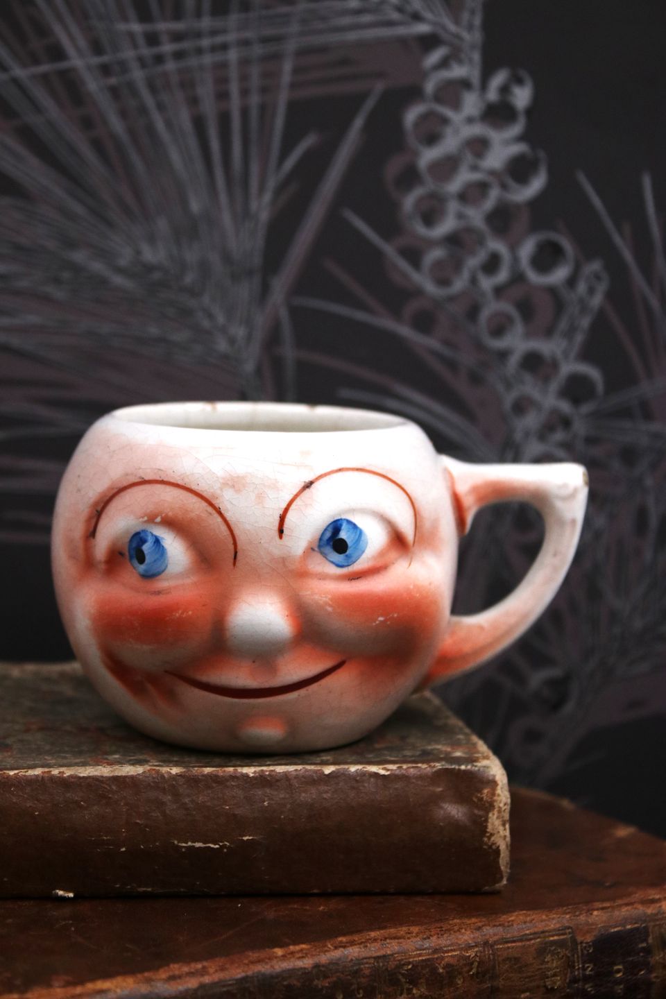 Old faience cups with handles and funny faces from around 1930.Measurements: H: 6.5cm. Dia.: 8.5-9cm.