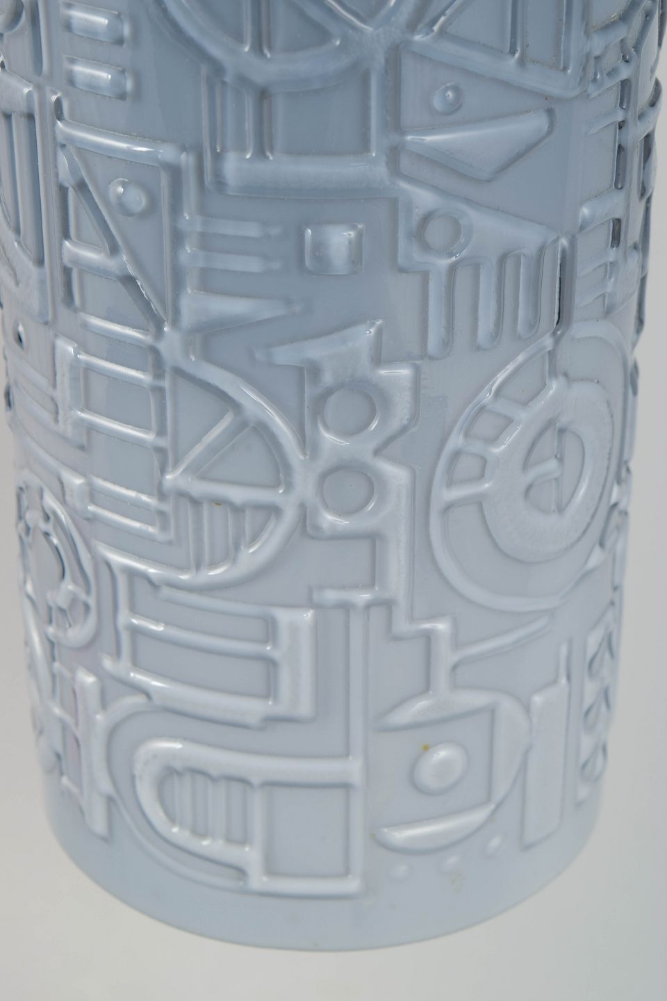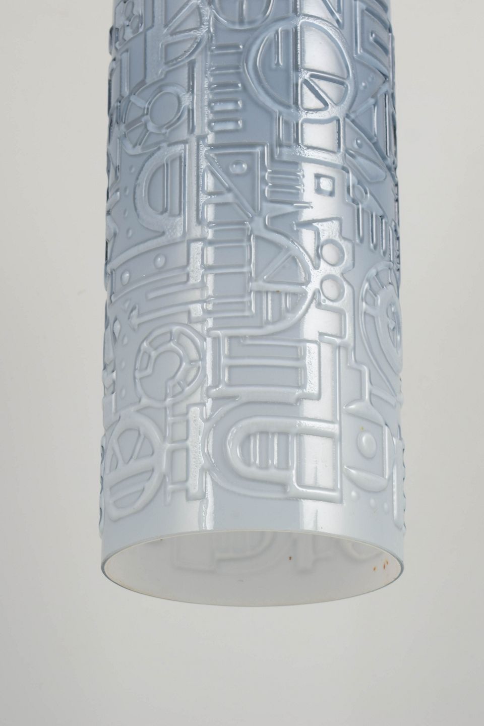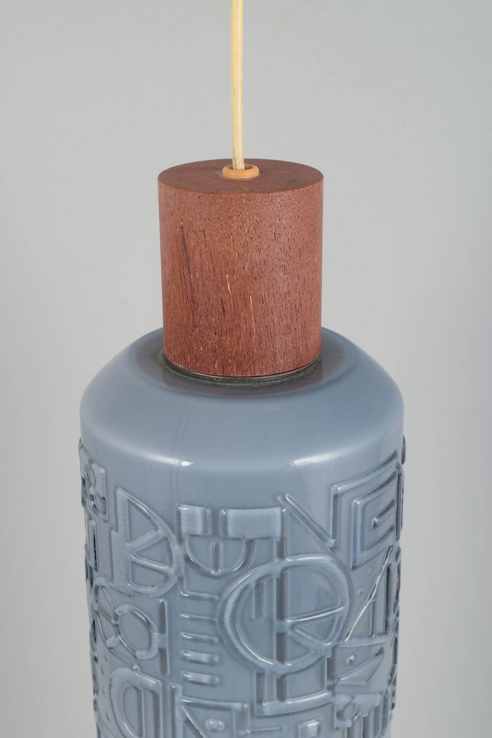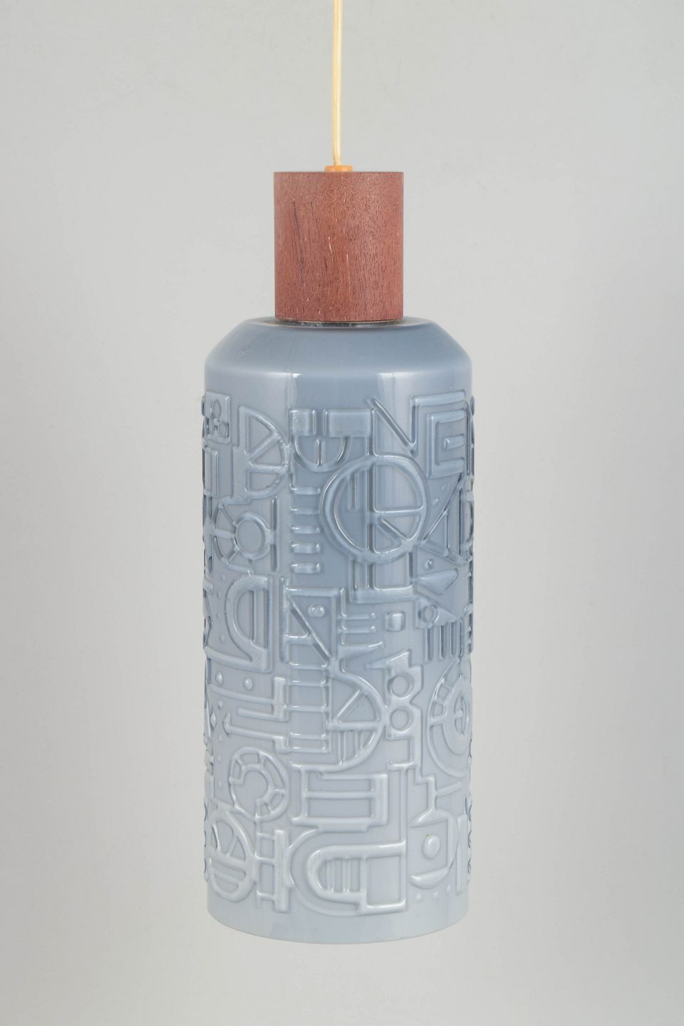 Cylindrical ceiling lamp in moulded glass with relief decoration in a geometric pattern. Executed in a muted grey-blue tone with wooden suspension and original cord.
