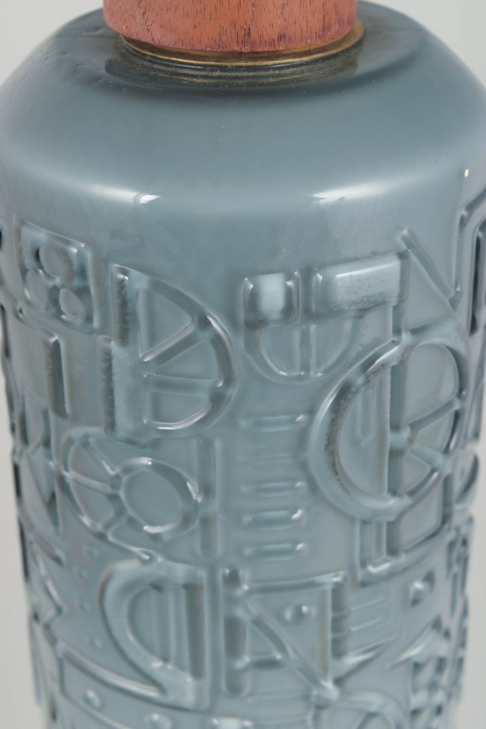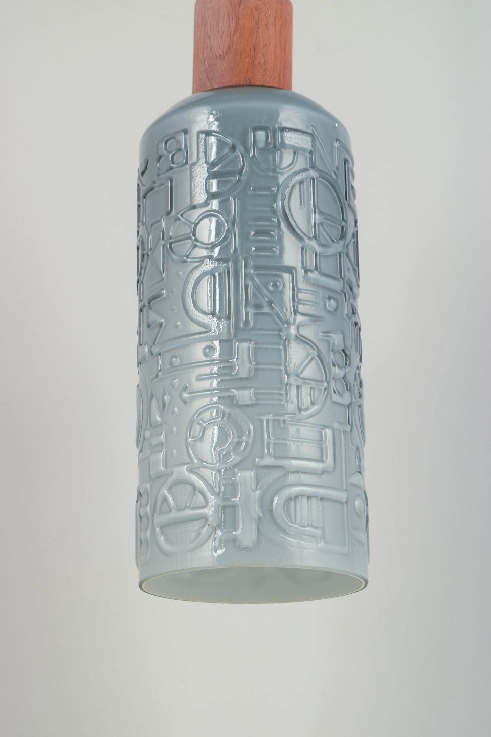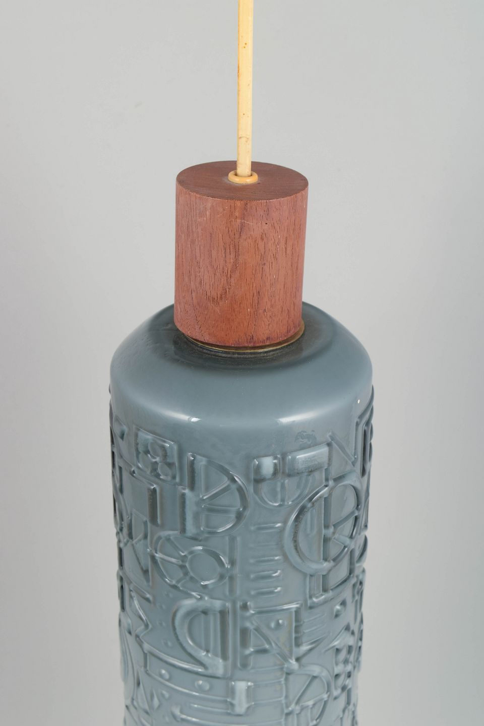 Jan Johansson for Orrefors, ceiling lamp.Cylindrical ceiling lamp in moulded glass with relief decoration in a geometric pattern. Executed in a muted grey-blue tone with wooden suspension and original cord.