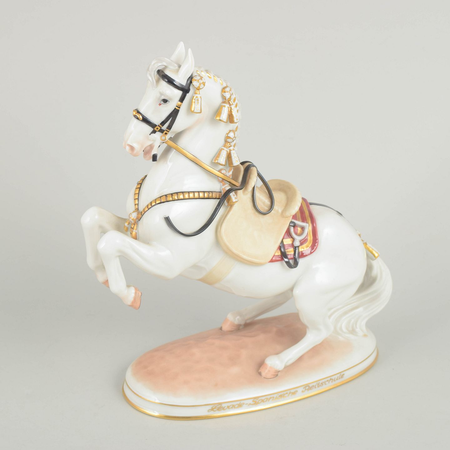 Augarten Vienna, horse figurine “Hofburg”.Finely modelled porcelain figure of a rearing horse with saddle and harness, decorated with delicate polychrome and gilt details. The “Hofburg” model, produced in Vienna and marked underneath.