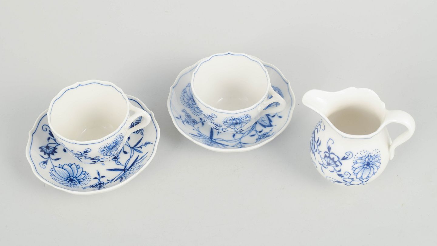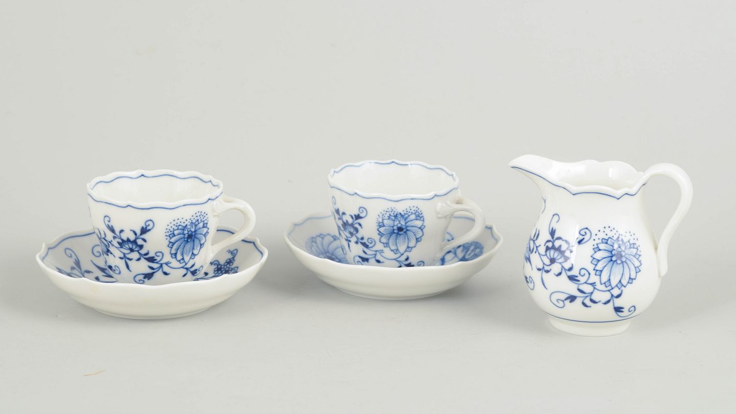 Meissen Blue Onion, set of two demitasse cups with matching saucers and creamer.Set consisting of two demitasse cups with matching saucers and a creamer in porcelain with hand-painted blue decoration in the classic Blue Onion pattern. Produced by Meissen in the mid 20th century and marked with Meissen crossed swords. Partly first factory quality and partly cancelled with two incised lines.