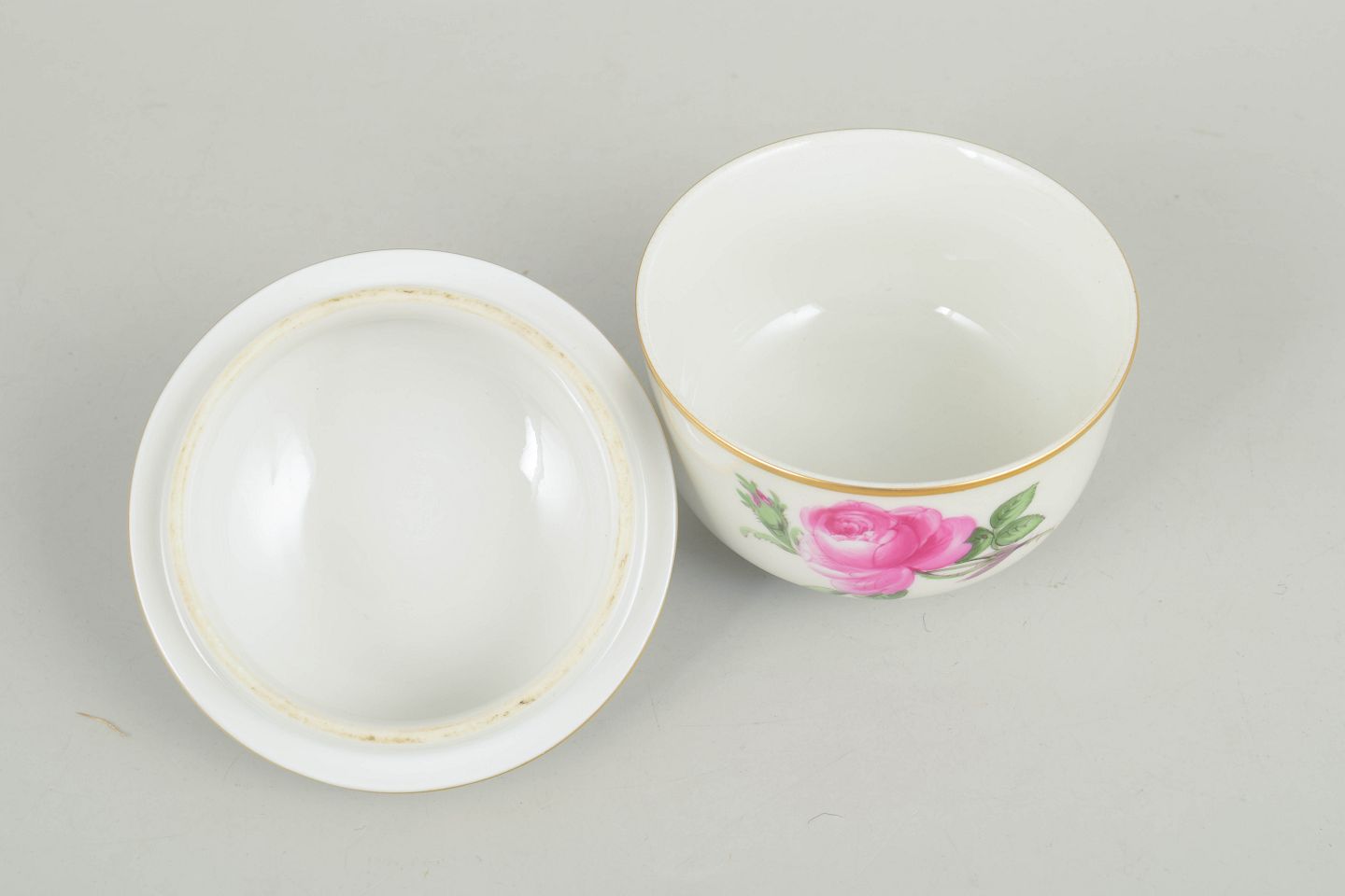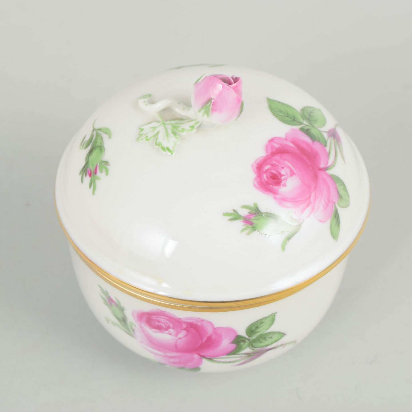 Porcelain sugar bowl with lid, hand painted with polychrome flowers and a gilt band. Decorated with larger rose motifs and a knop-shaped finial in classic Meissen style from the mid 20th century. Marked on the base with Meissen crossed swords and cancelled with two incised lines.