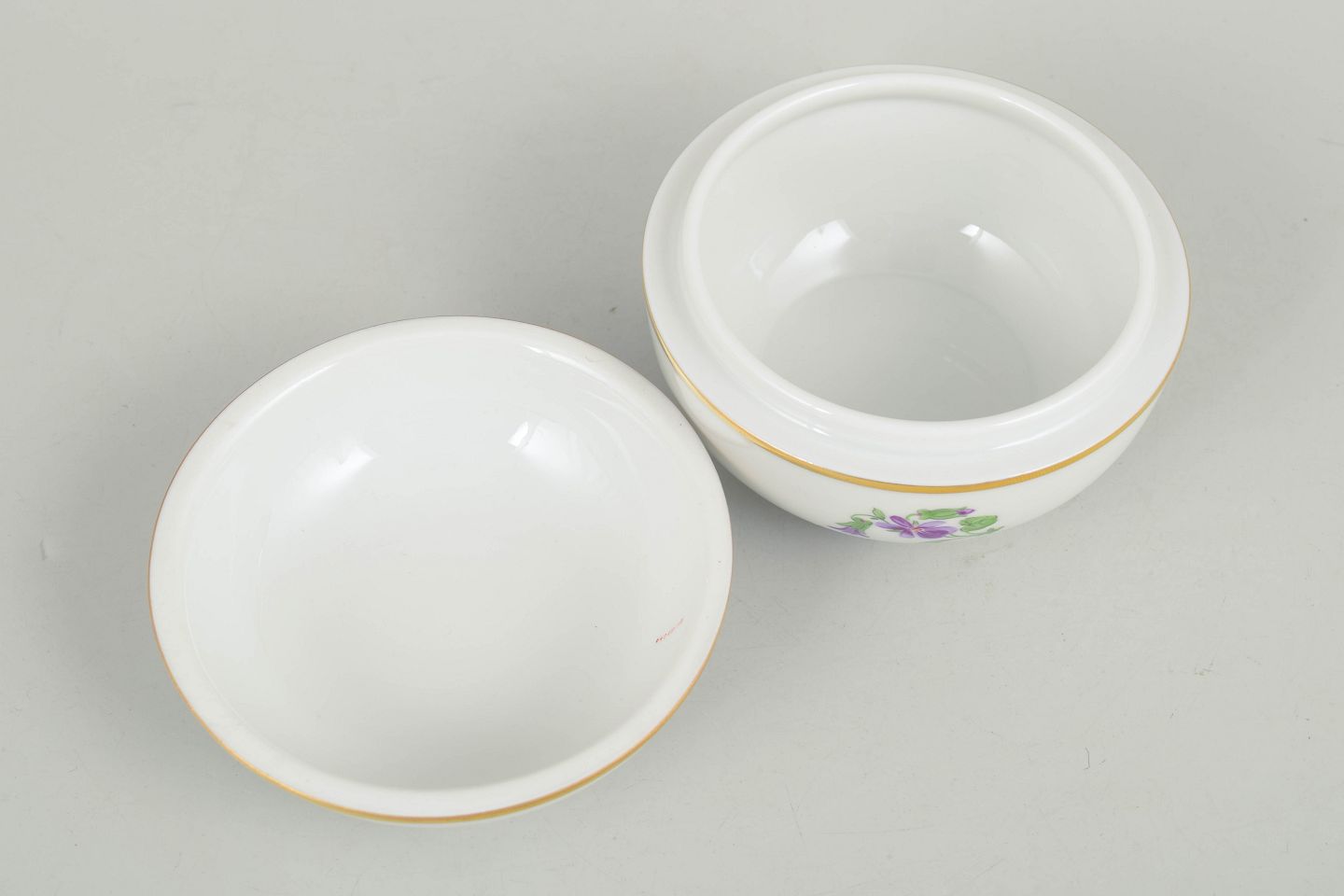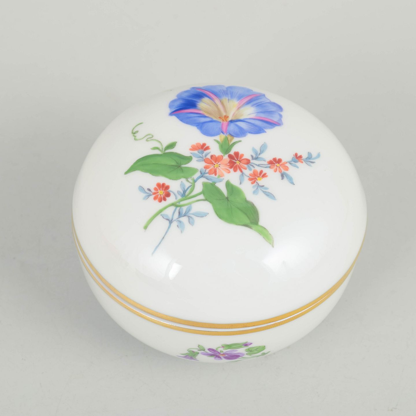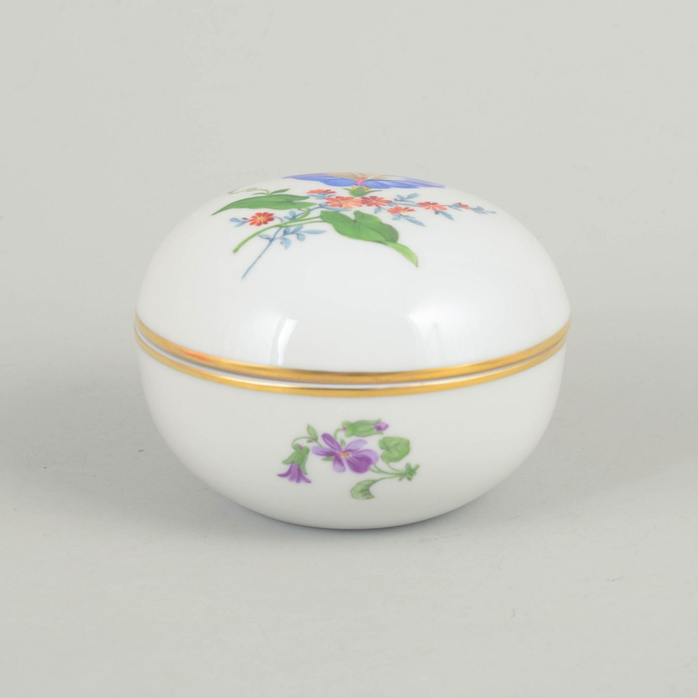 Meissen, lidded jar with polychrome flower decoration.Round porcelain lidded jar hand painted with polychrome flowers and decorated with a gilt band. Classic Meissen example from the mid 20th century with well-fitted lid and elegant, simple form. Marked on the base with Meissen crossed swords and cancelled with two incised lines.