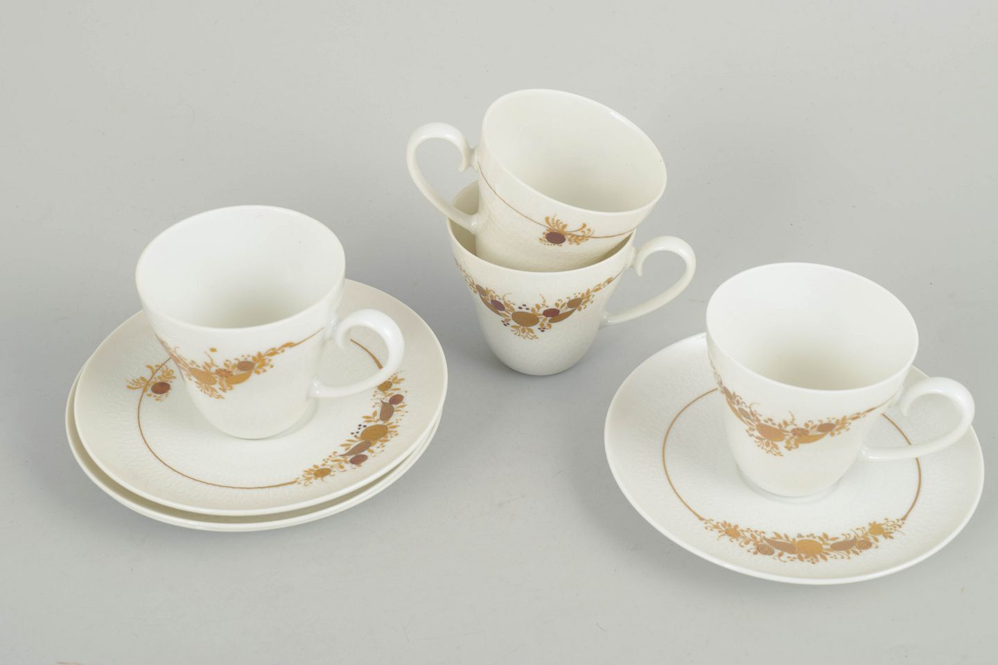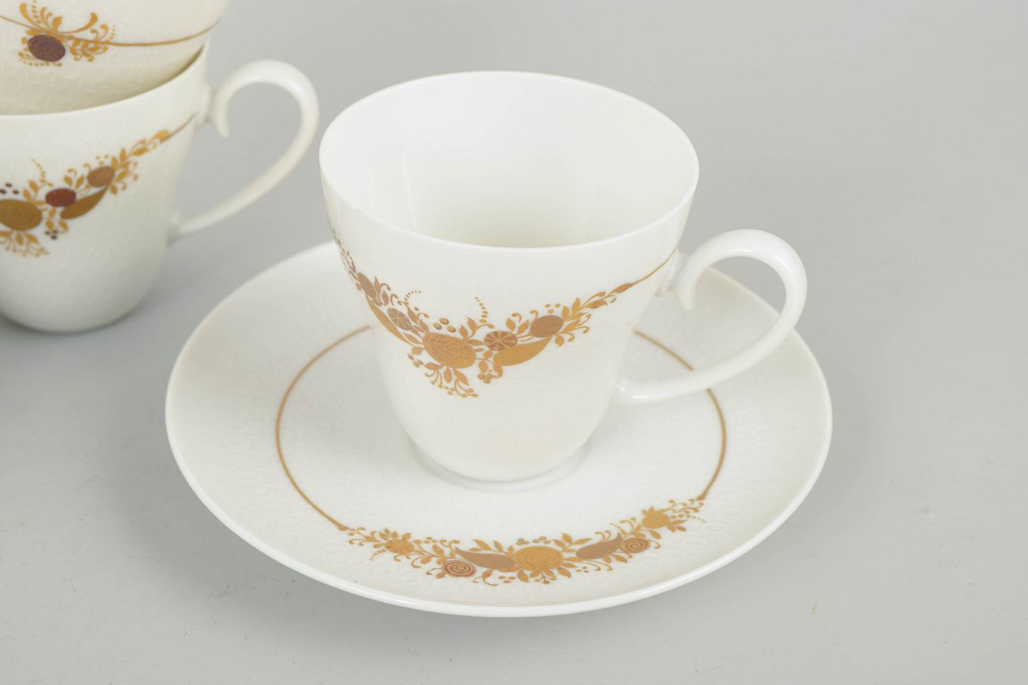 Bjørn Wiinblad for Rosenthal, set of four coffee cups with matching saucers.Set consisting of four coffee cups with matching saucers in porcelain decorated with the characteristic floral ornament from the Romanze series. The decoration appears in golden tones with fine detailing and an elegant, romantic expression, typical of Wiinblad’s design language in the 1970s.