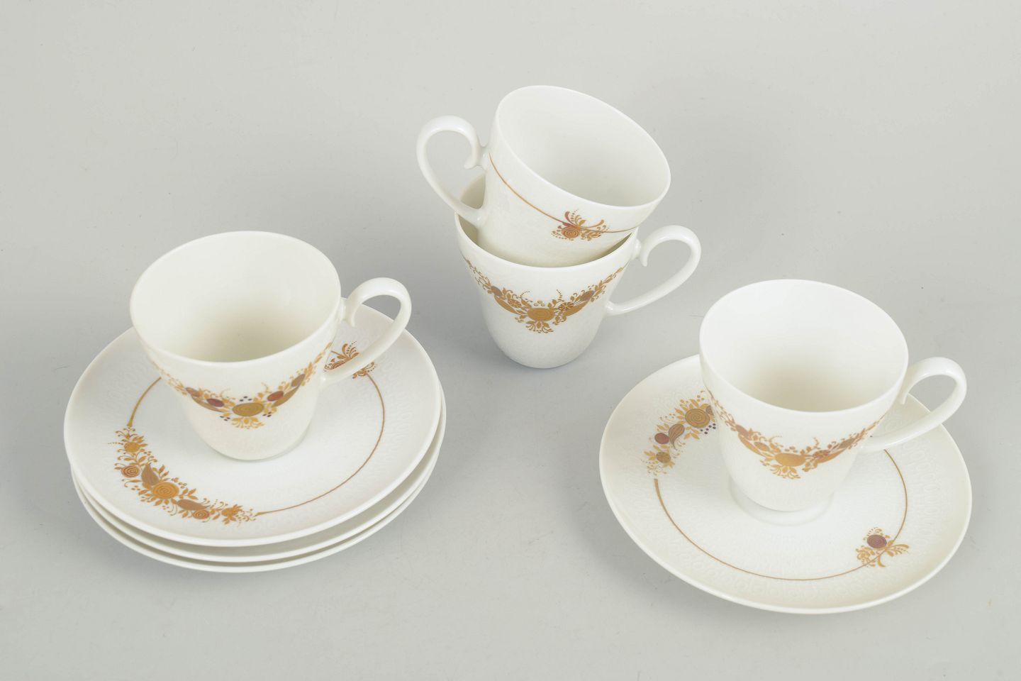 Set consisting of four coffee cups with matching saucers in porcelain decorated with the characteristic floral ornament from the Romanze series. The decoration appears in golden tones with fine detailing and an elegant, romantic expression, typical of Wiinblad’s design language in the 1970s.