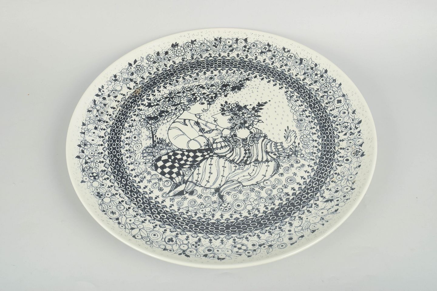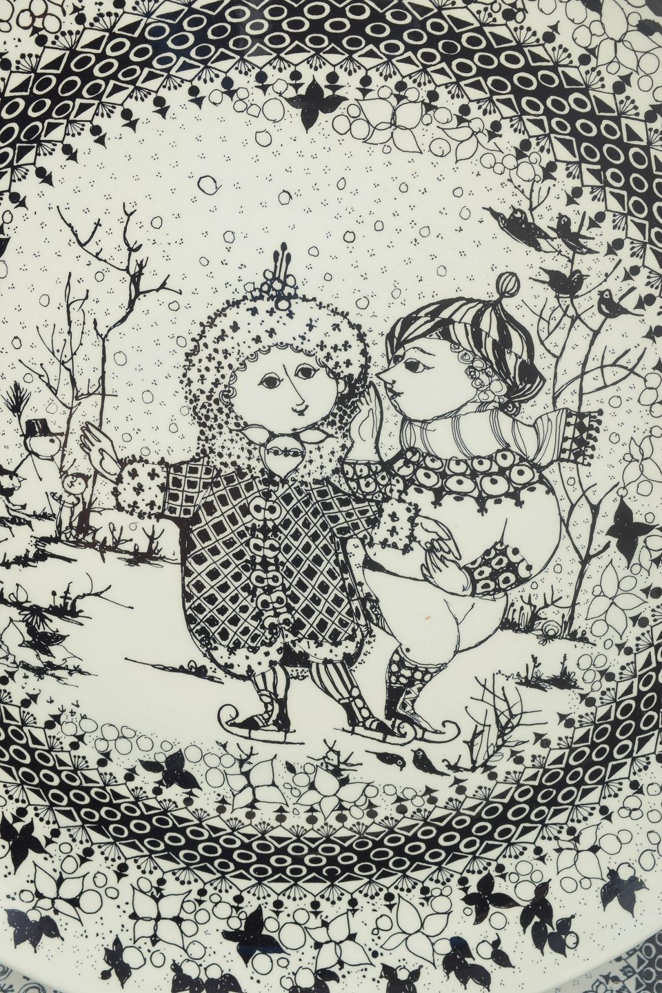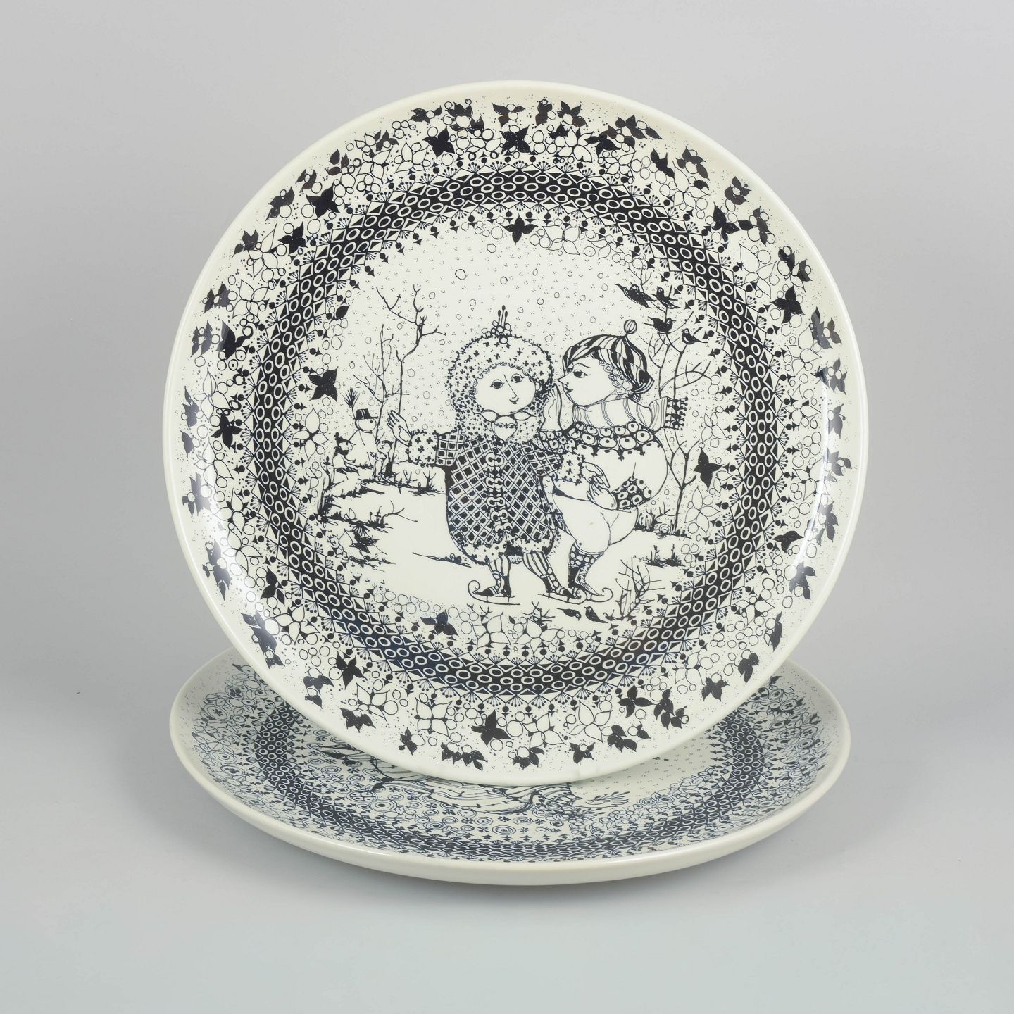 Bjørn Wiinblad for Nymølle, two large faience dishes “The Seasons” winter and spring.Decorative round faience dishes with black line decoration in Bjørn Wiinblad’s characteristic whimsical style, featuring figurative scenes and ornamental borders. The motifs represent the seasons winter and spring.