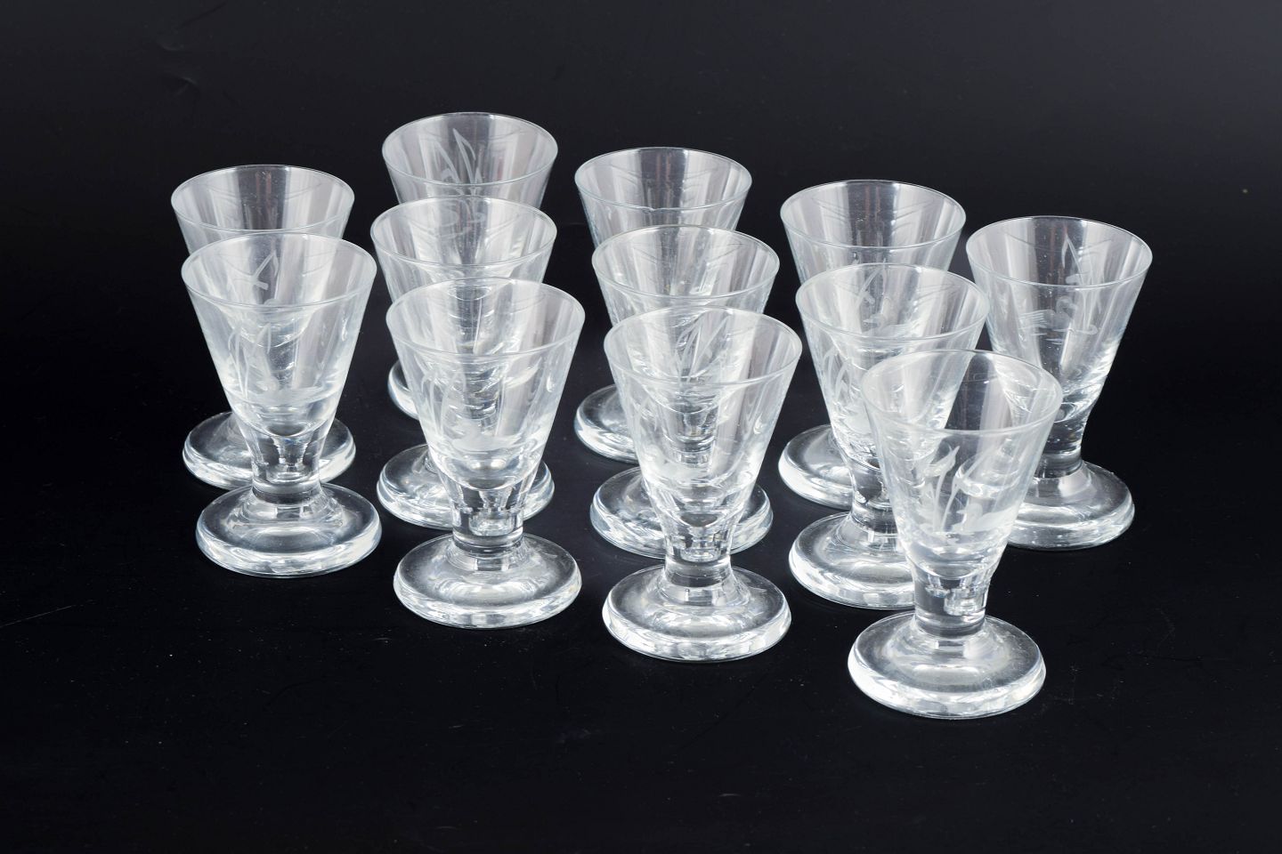 Scandinavian glassworks, set of twelve schnapps glasses with duck and reed motif.