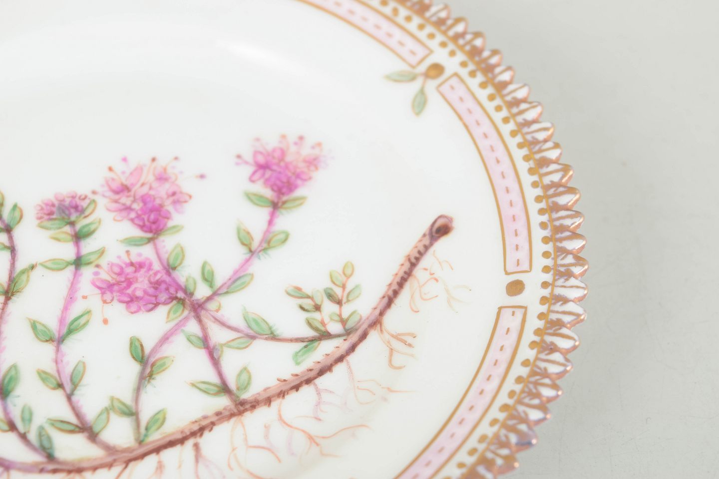 Royal Copenhagen Flora Danica plate.Hand-decorated porcelain plate with botanical motif from the Flora Danica series, decorated outside the factory, finely executed with gilded rim and highly detailed plant illustration.