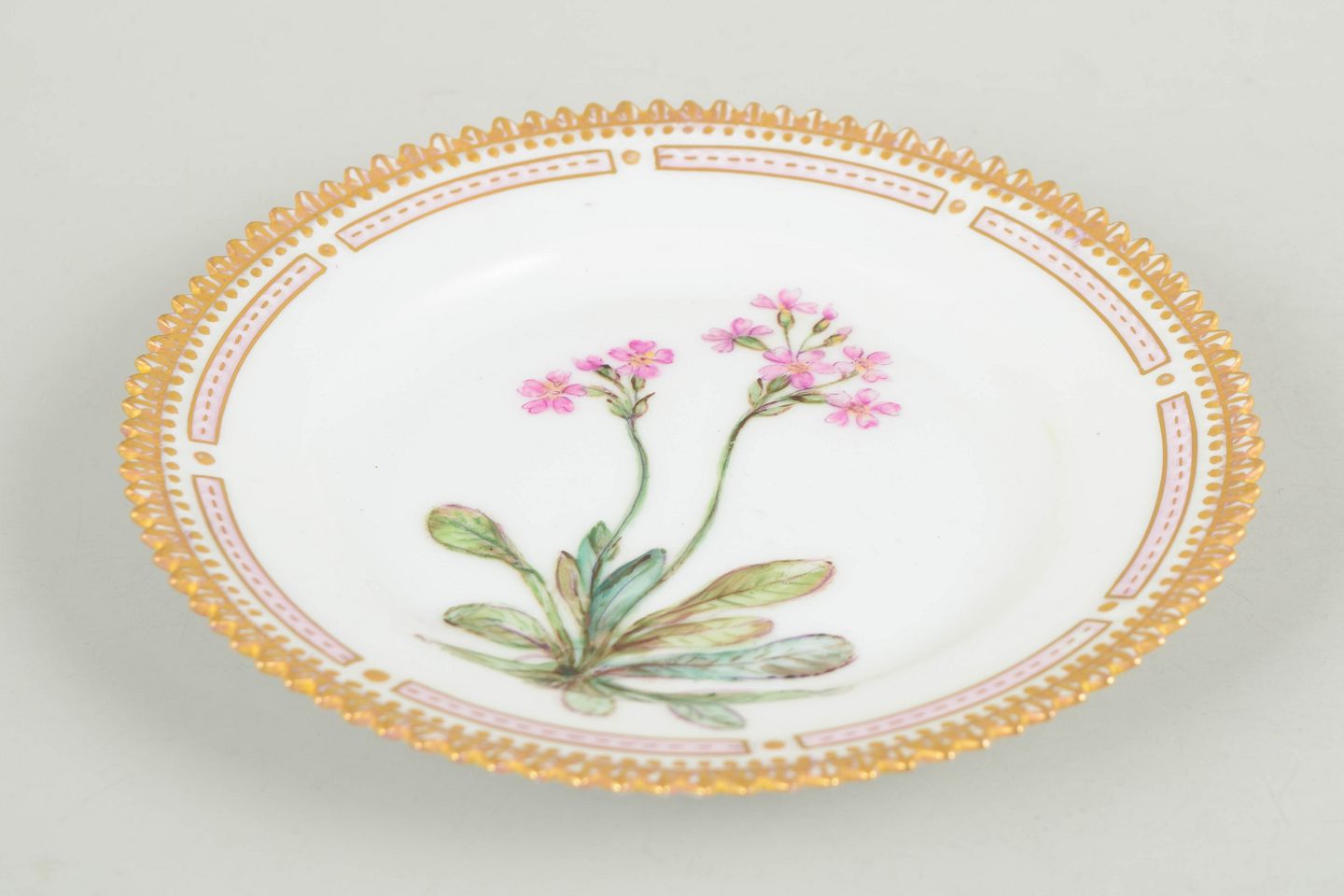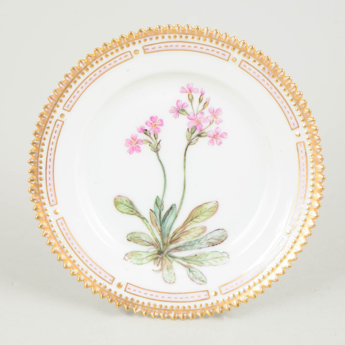 Royal Copenhagen Flora Danica, side plate.Hand-decorated porcelain plate with botanical motif from the Flora Danica series, decorated outside the factory, finely executed with gilded rim and highly detailed plant illustration.