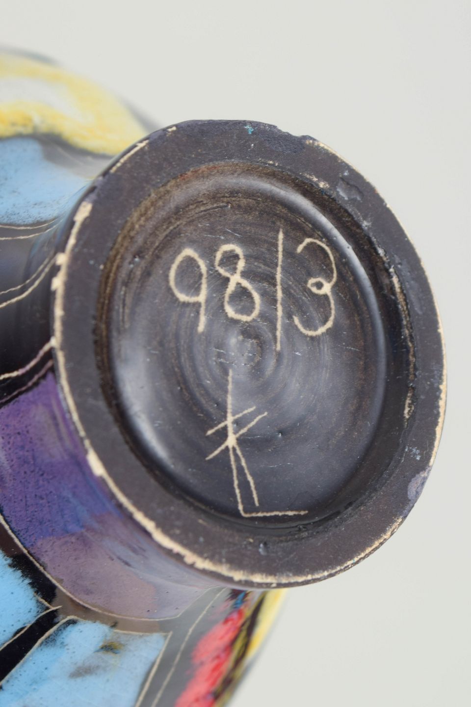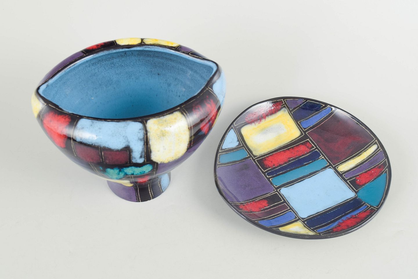 Ludwig Klopfer for Johann Lipp, vase and dish.Decorative ceramic vase with integrated foot and matching dish, featuring a multicoloured glaze with abstract fields in blue, red, yellow, and violet tones. A characteristic example of mid-20th century German art pottery.