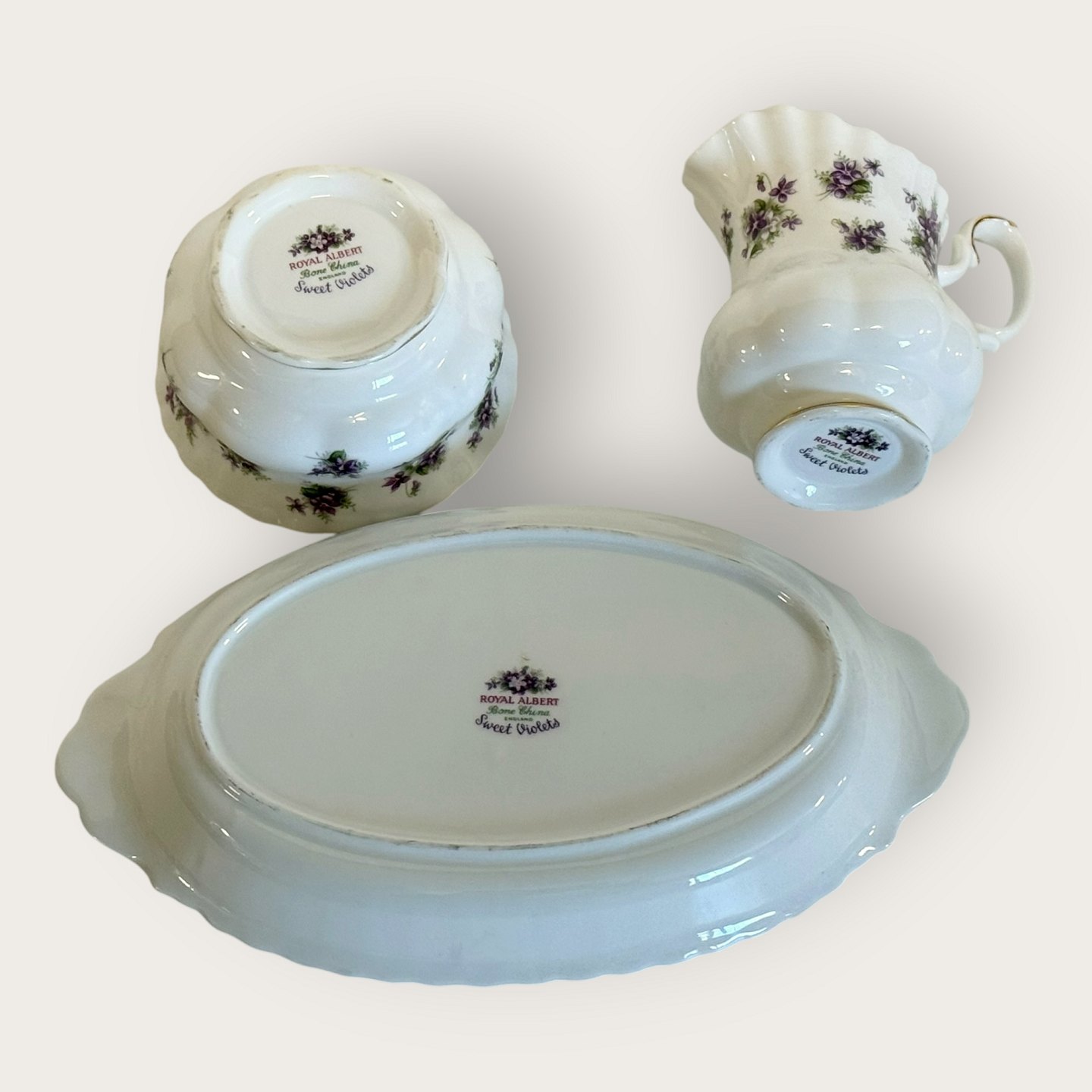 Royal Albert, Bone China, Sweet violets, Field violet, Sugar, cream set on small tray, tray measures 22x13cm *Perfect condition*Stock: 1