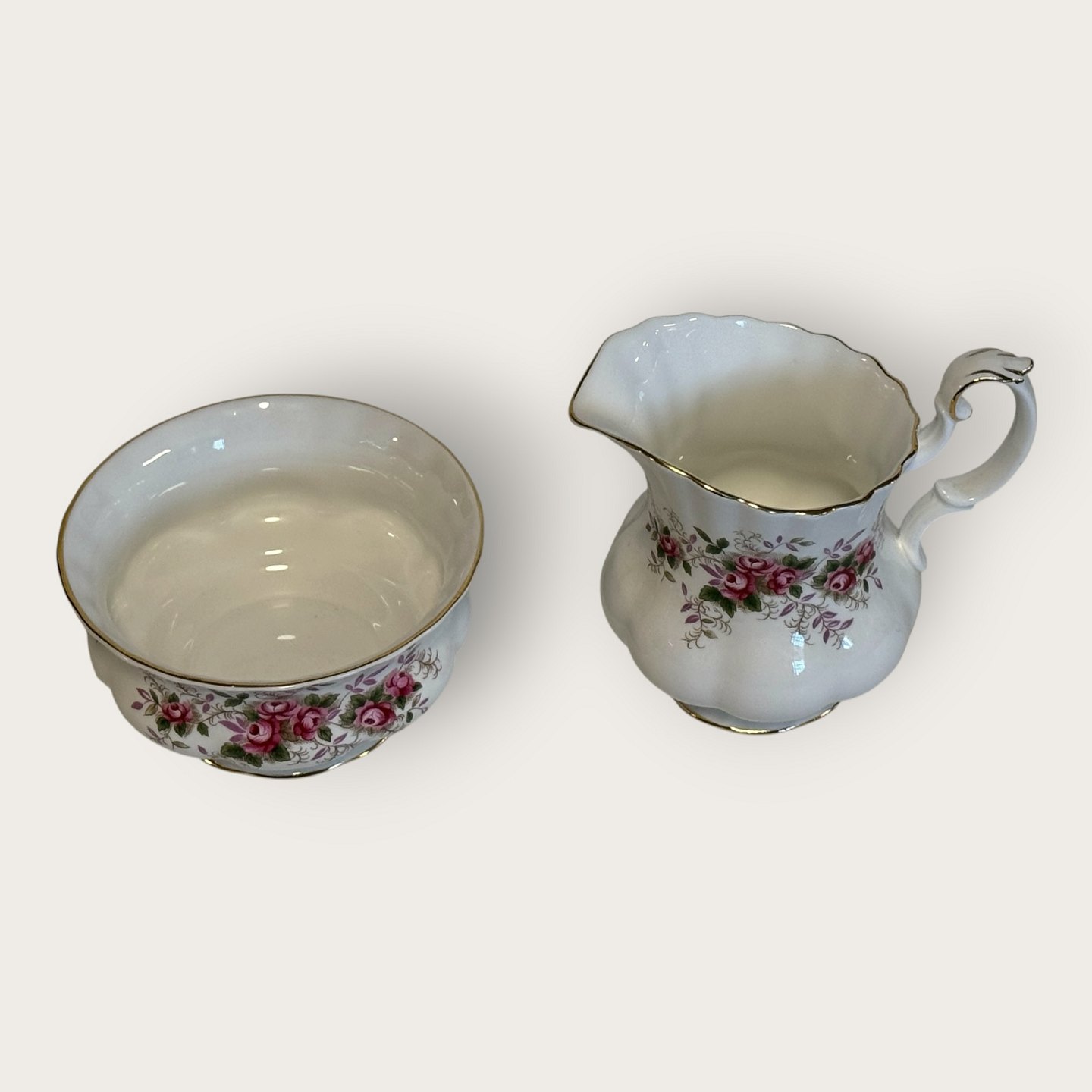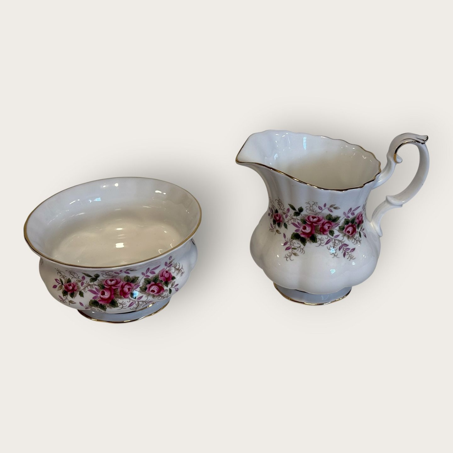 Royal Albert, Bone China, Lavender Rose, Large Sugar and Cream Set, sugar bowl height 6cm, diameter 11cm, creamer approx. hxwxl 10.5x12x8.5cm *Perfect condition*Stock: 1