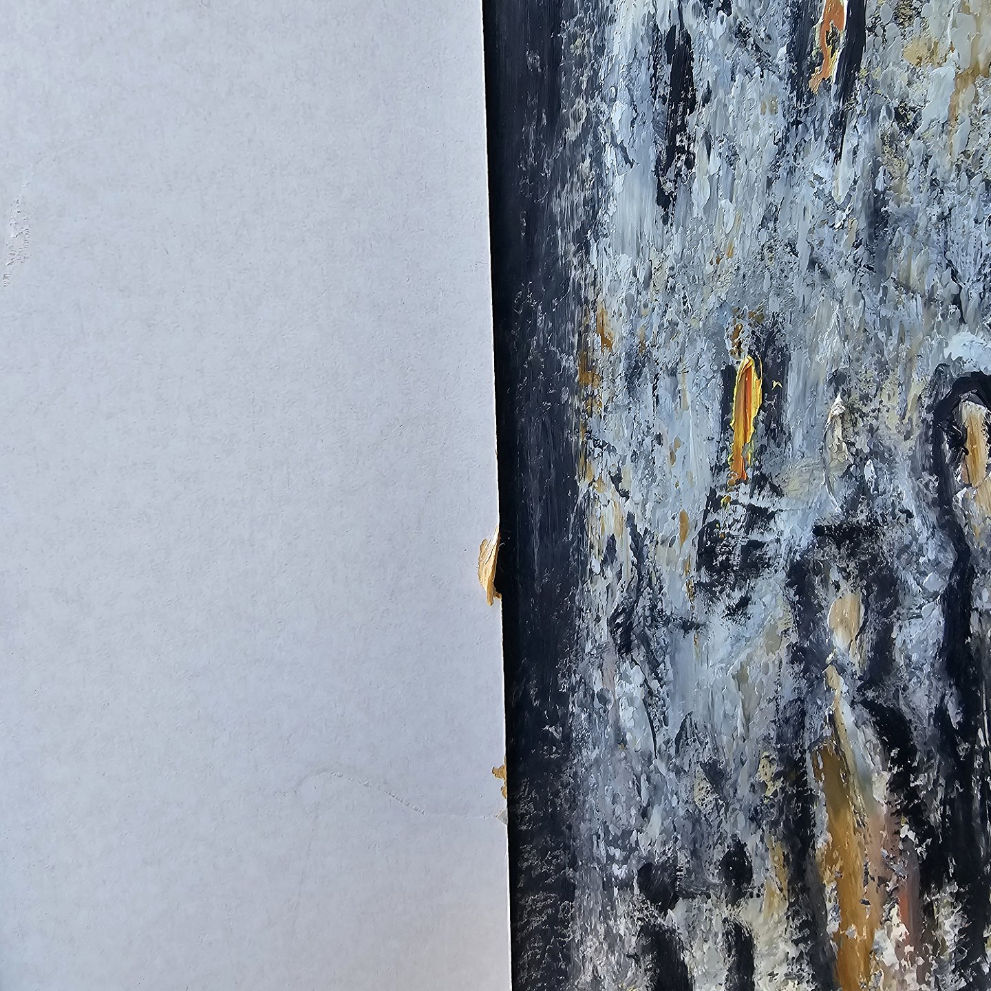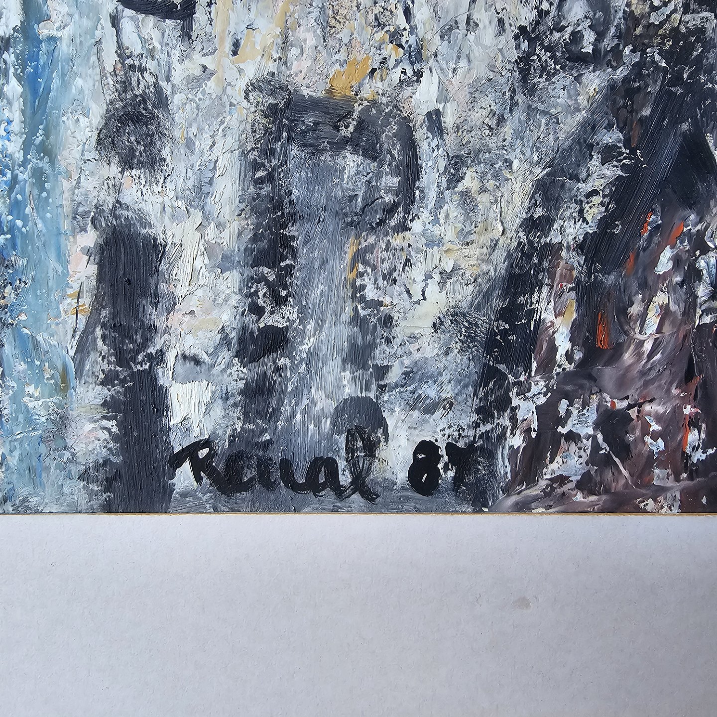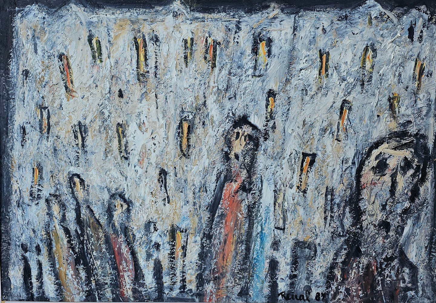 Oliemaleri på papir med abstrakt motiv af mennesker. Monteret i sølvfarvet ramme, dateret 1987Kunstner Renal Bache (1926-1989), signeret