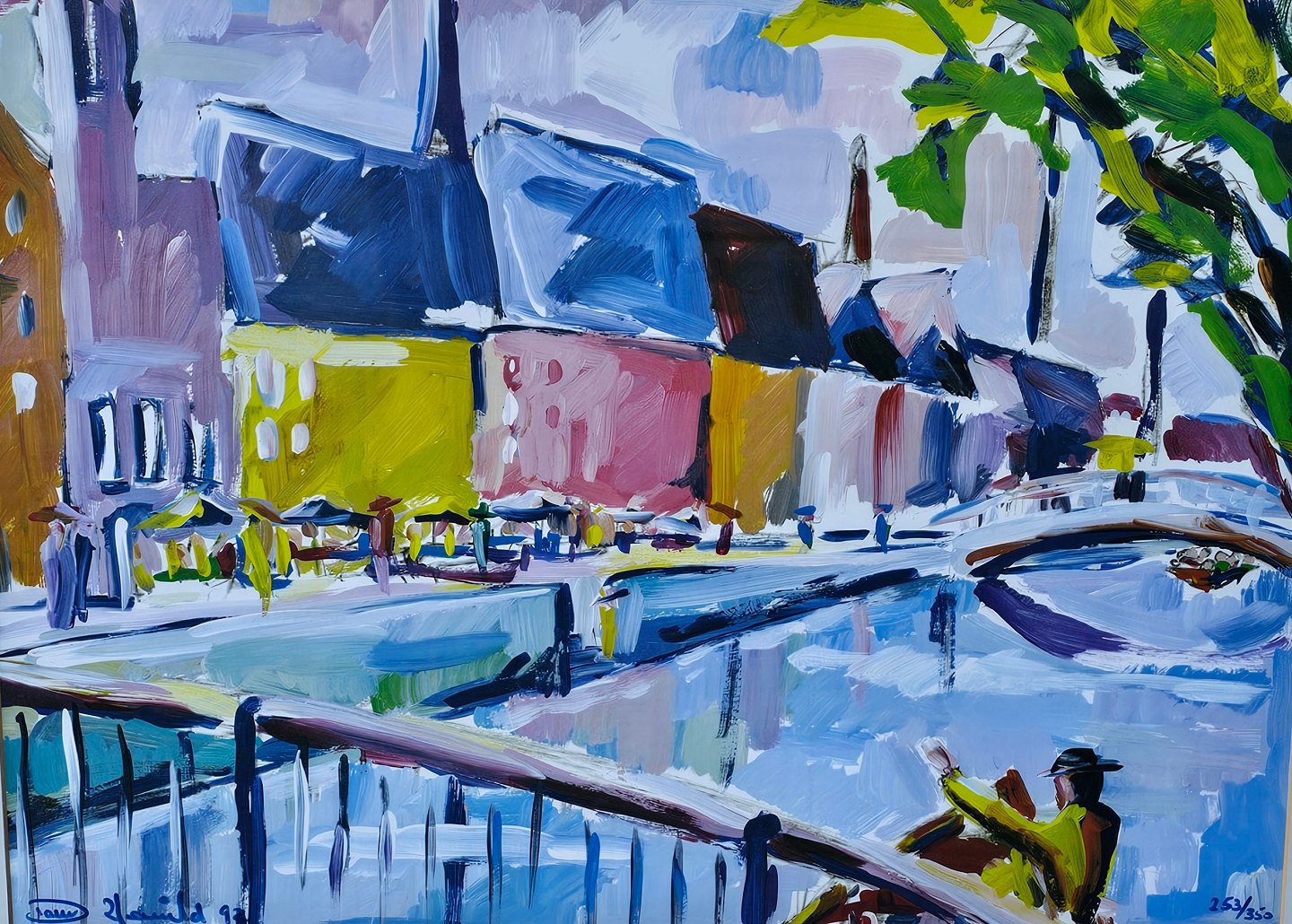 Litografi med motiv af et havnemiljø i guldmalet træramme. Nr. 253/350, dateret 1992Kunstner Palle Mernild (1962-), signeret