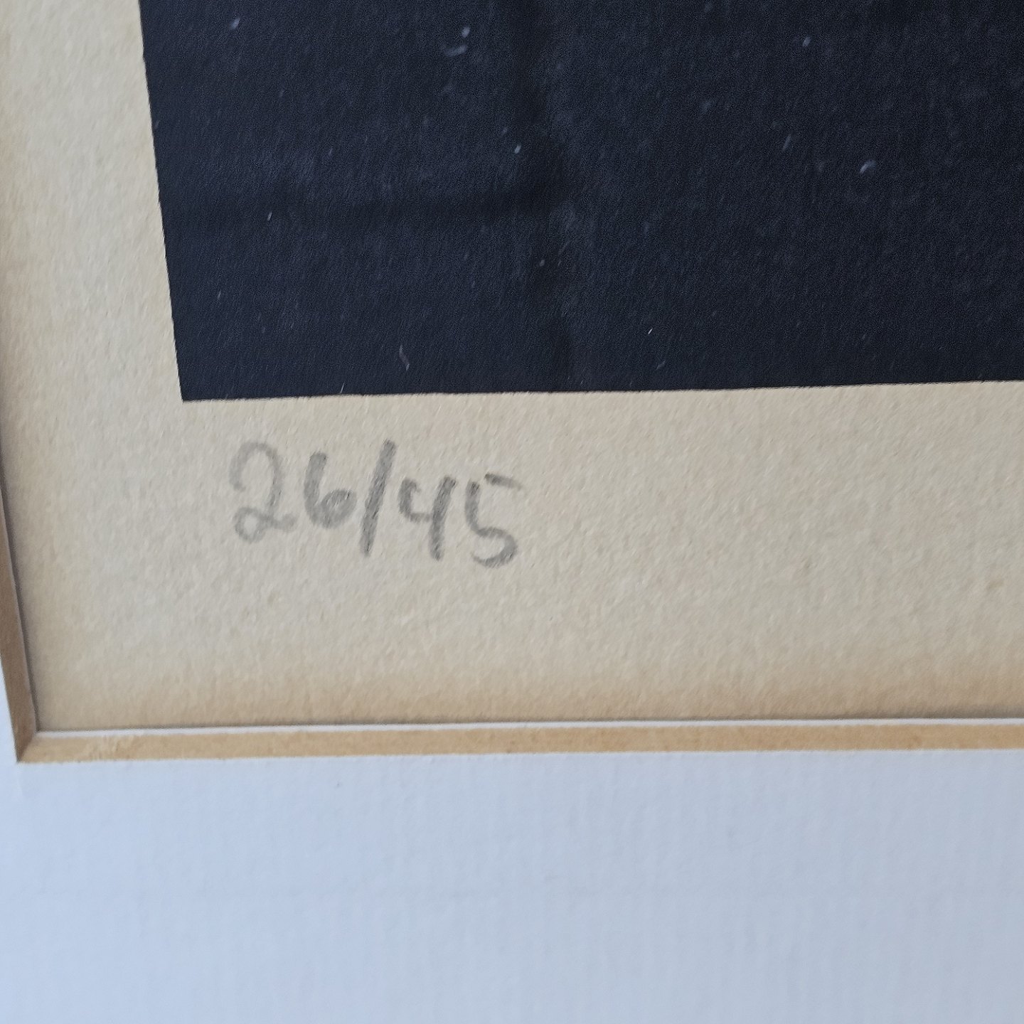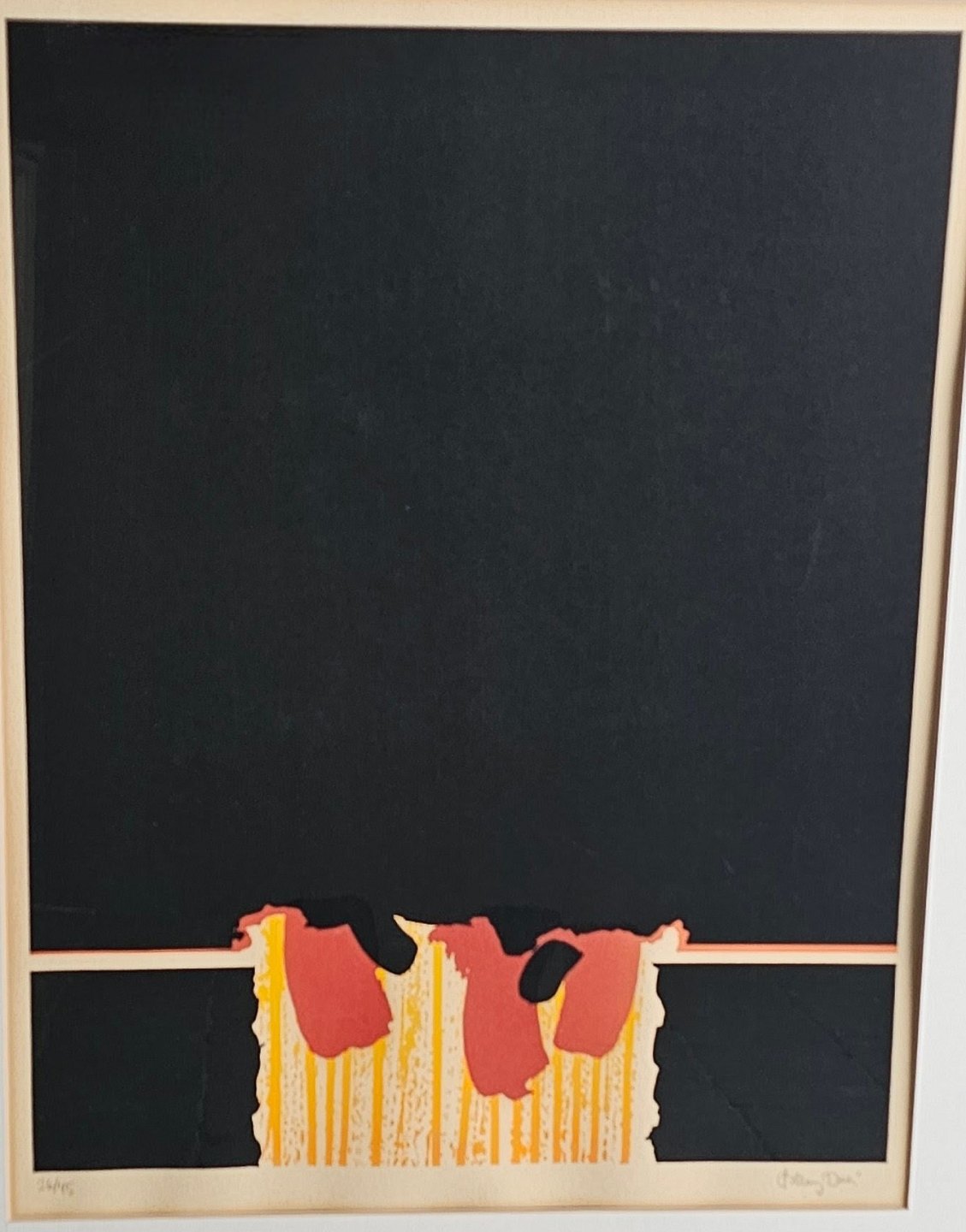 Litografi med abstrakt motiv og røde og gule nuancer monteret i metal rammeNr. 26/45