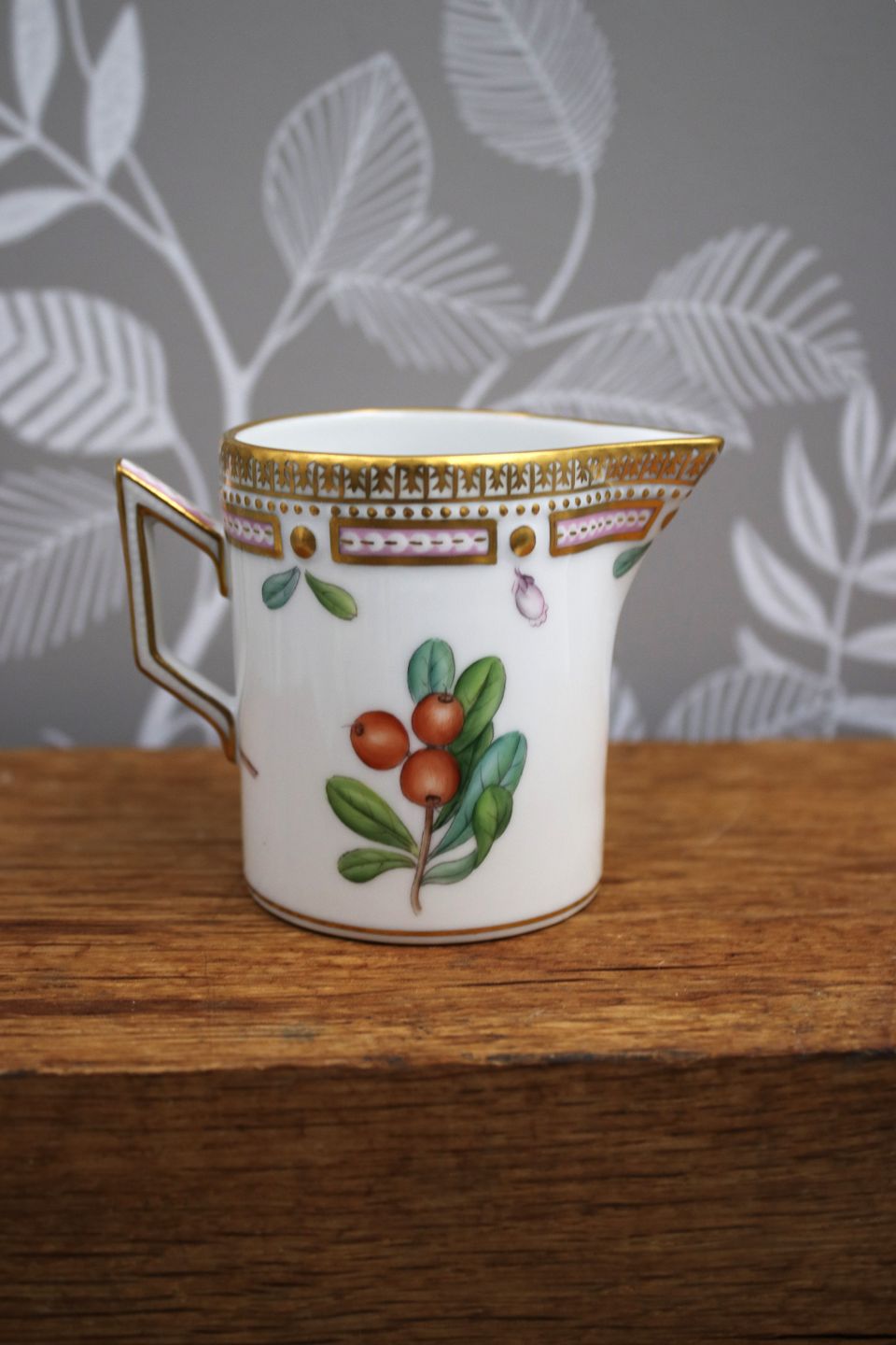 Creamer in Flora Danica set produced by Royal Copenhagen in Denmark. H: 7cm. Dia: 5.5cm. The motif is a hand-painted botanical illustration of the plant Arbutus Uva-ursi. (Mispelris)It is one of the world's most prestigious porcelain series.