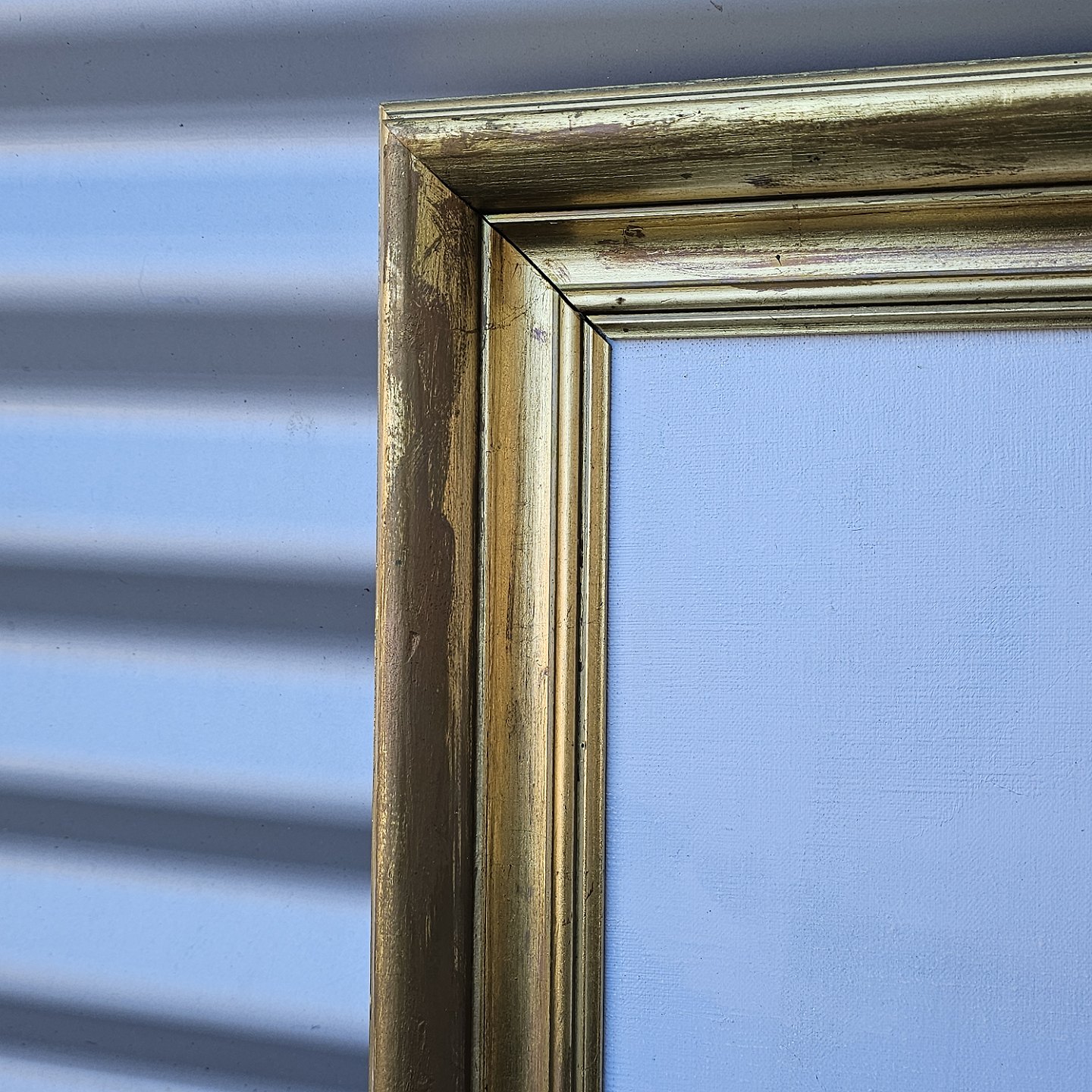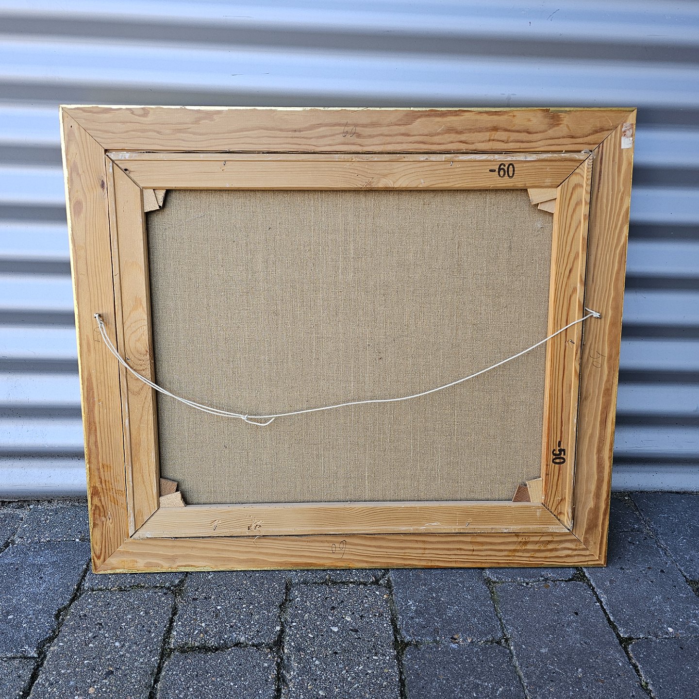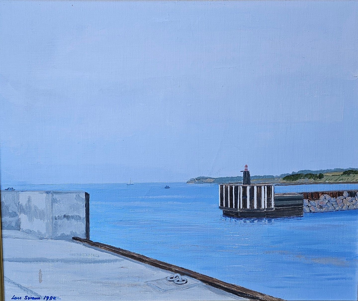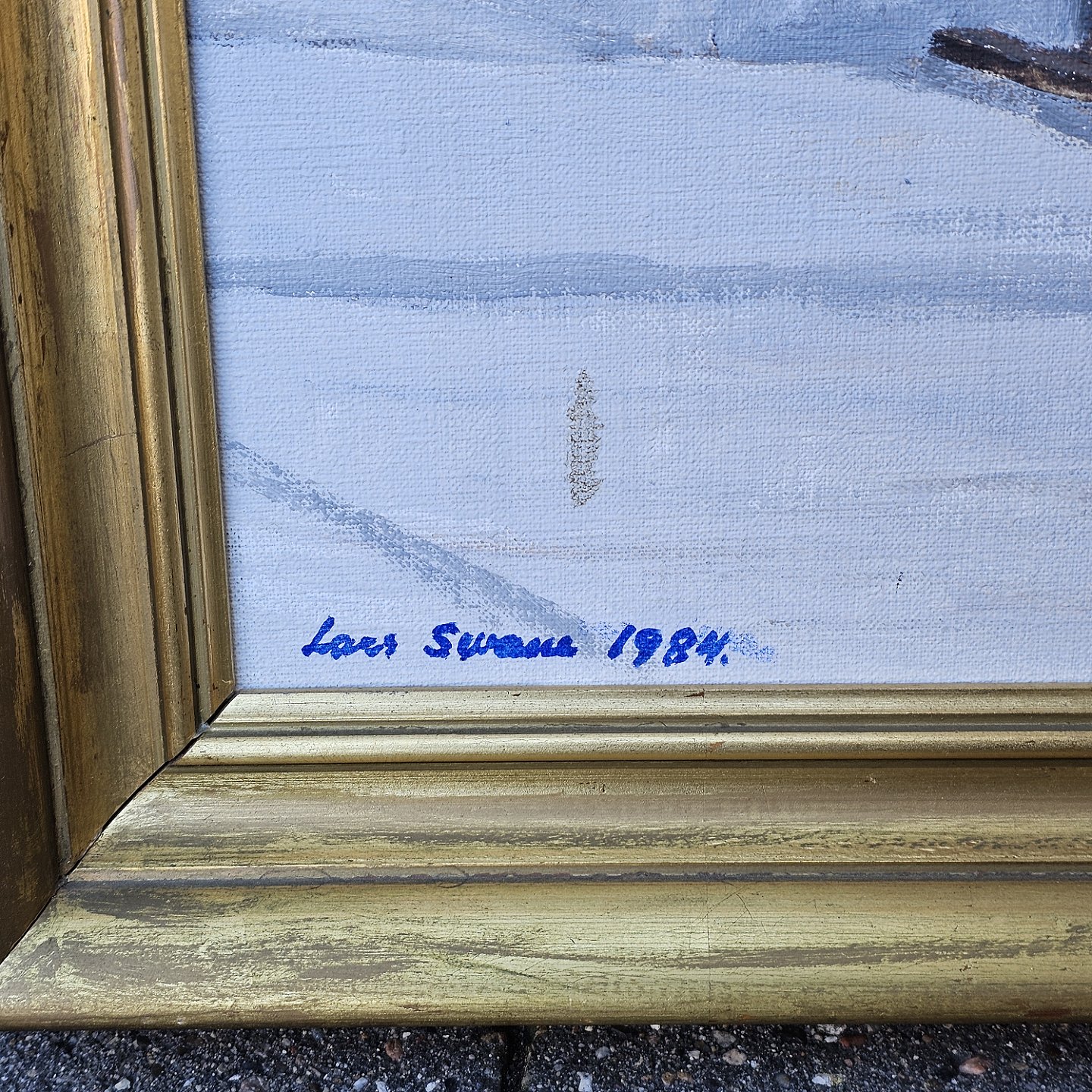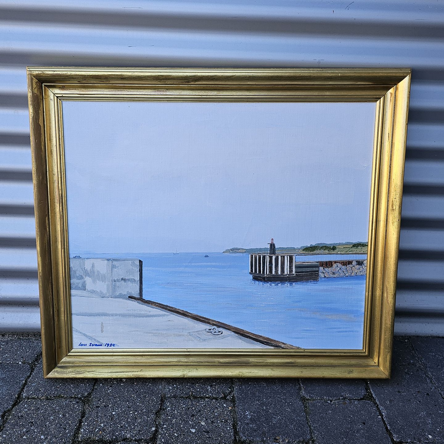 Oliemaleri på lærred med motiv af en havn monteret i guldmalet trærammeKunstner Lars Swane (1913-2002), signeret