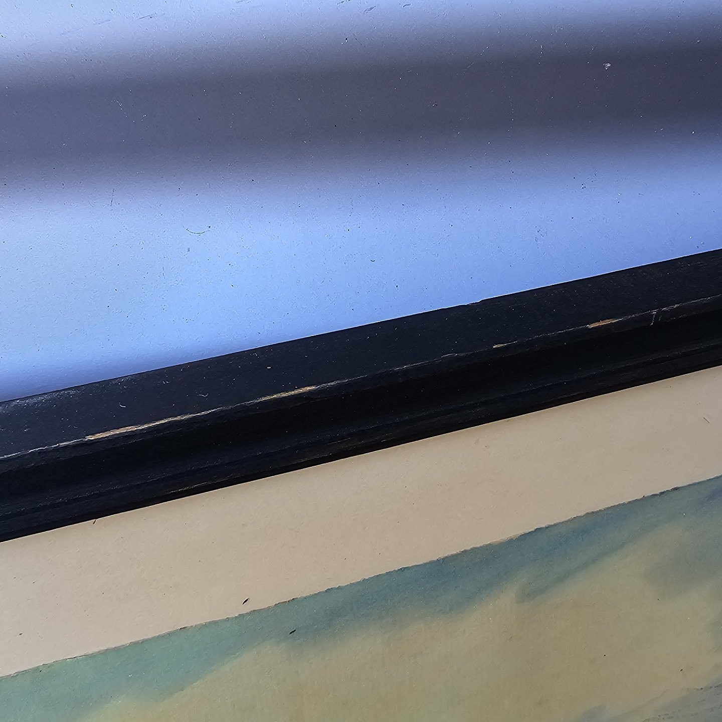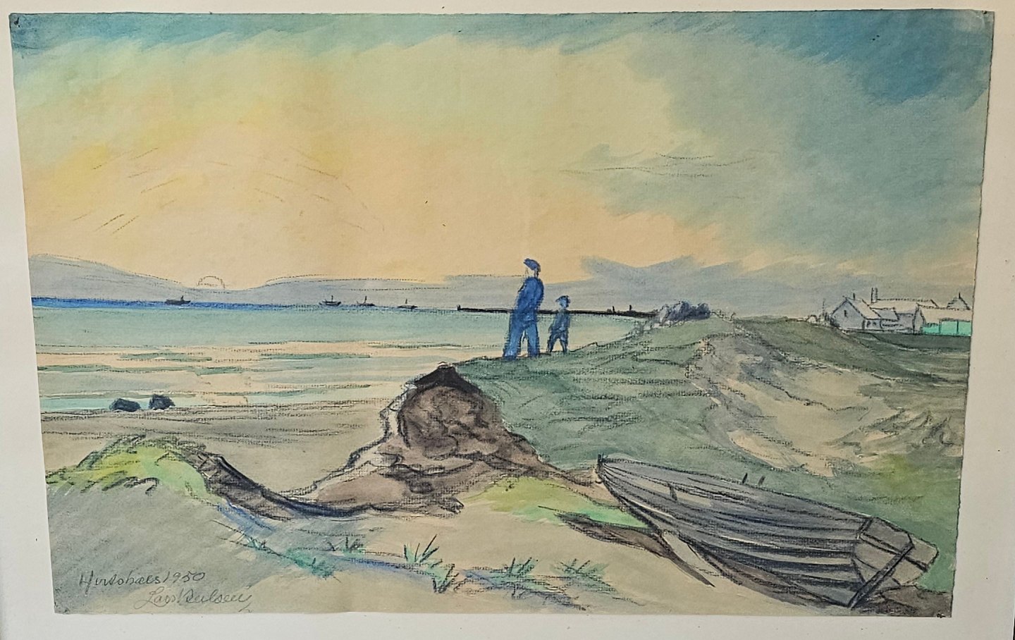 Akvarel maleri på papir med motiv af en mand og en dreng, som kigger ud over havet. Monteret i sortmalet træramme, dateret 1950Kunstner Lars Nielsen (1883-1965), signeret