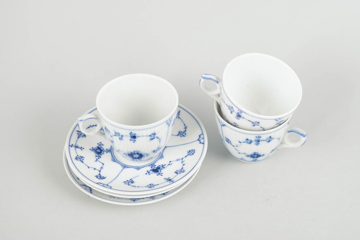 Three coffee cups with matching saucers in porcelain, hand-painted in underglaze blue in the classic Blue Fluted Plain pattern. Model 1/80. Some first factory quality, some factory seconds marked with one or two incised lines.