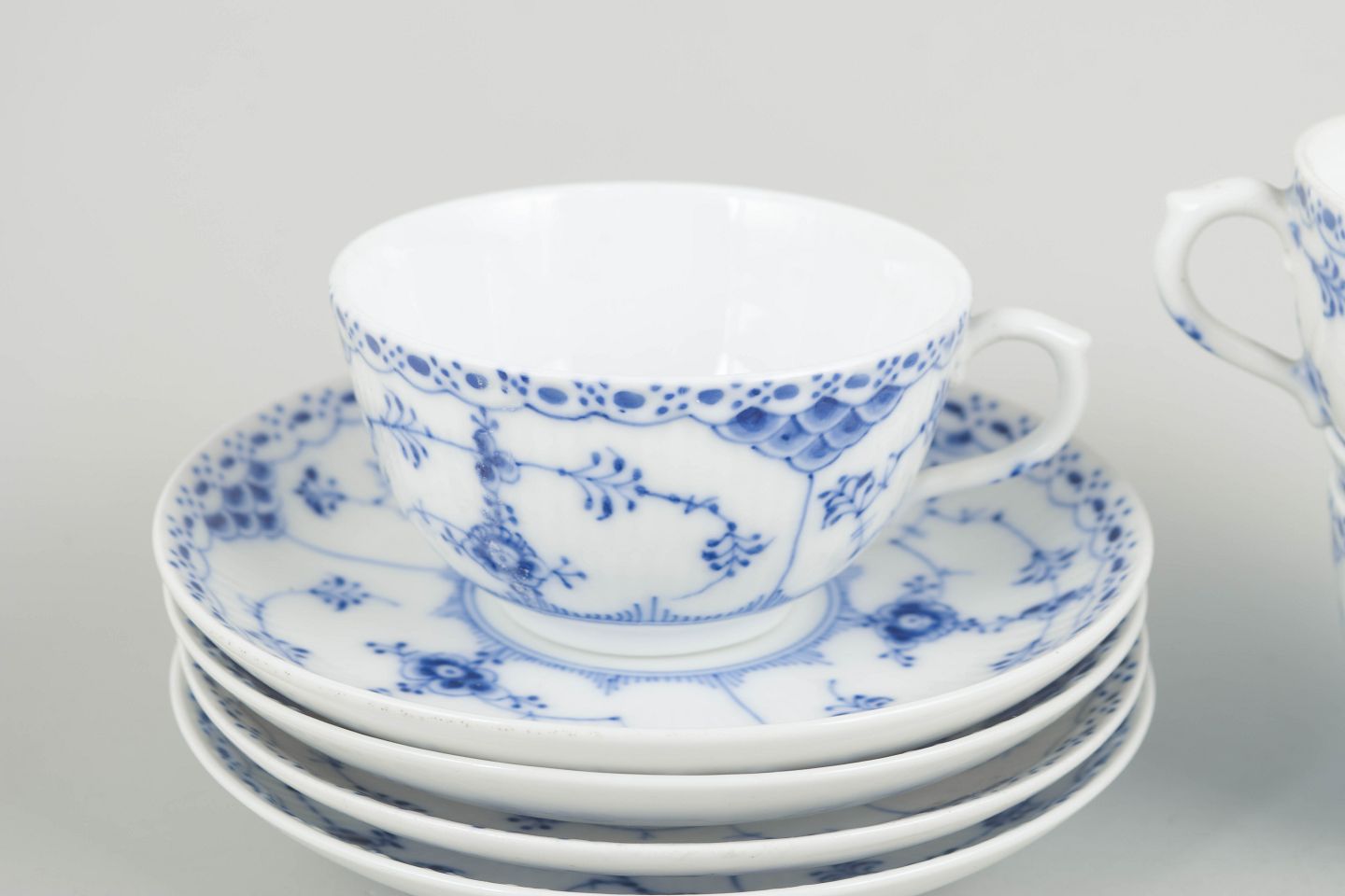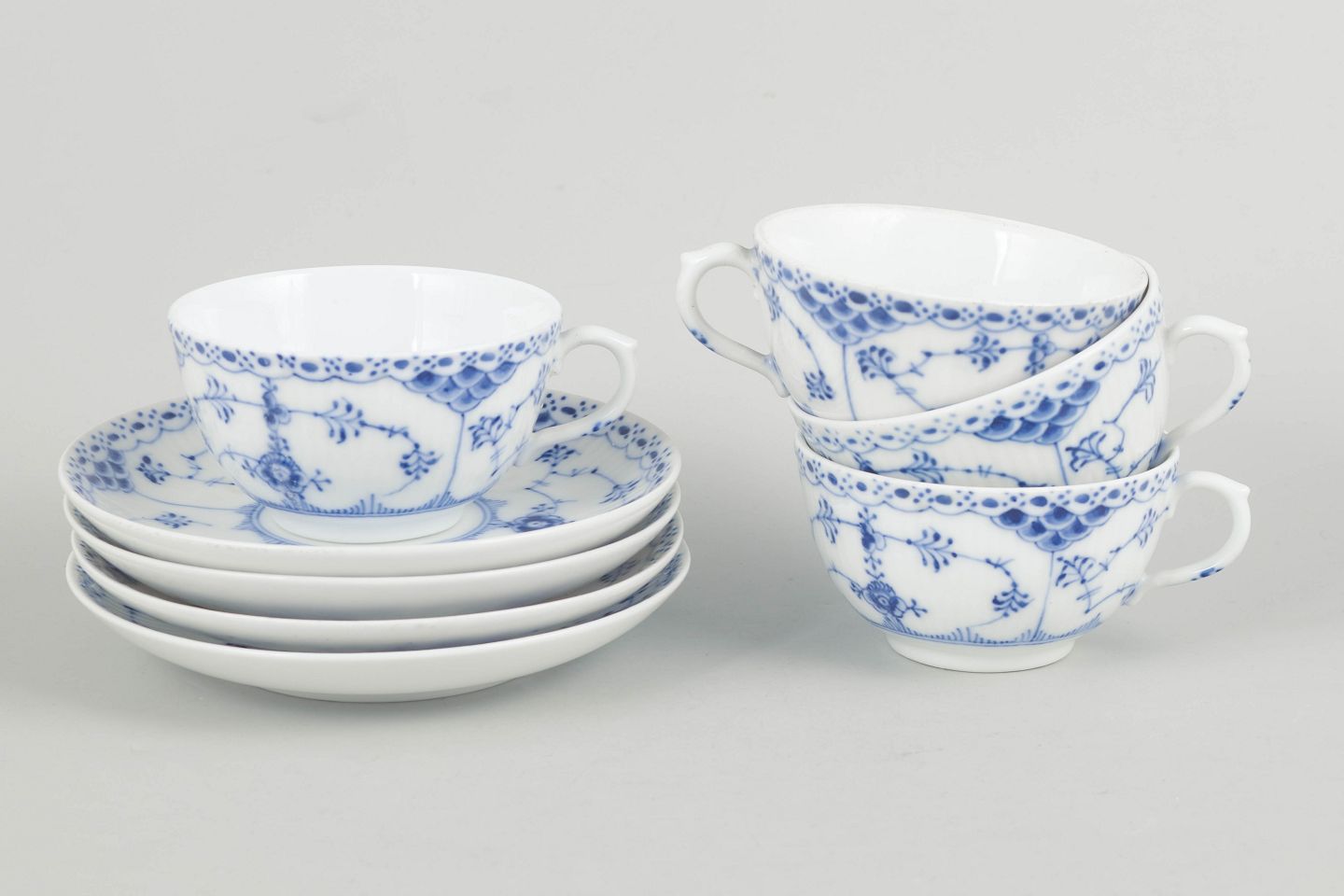 Royal Copenhagen Blue Fluted Half Lace coffee cups with saucers, set of four.Coffee cups with matching saucers in porcelain, hand-painted in underglaze blue in the classic Blue Fluted Half Lace pattern. Model 1/713. First factory quality.