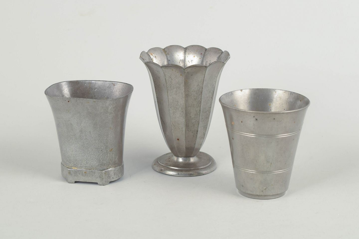 Three small vases in pewter, executed in varied and elegant art deco designs. Models 2549, 1313 and 1123.