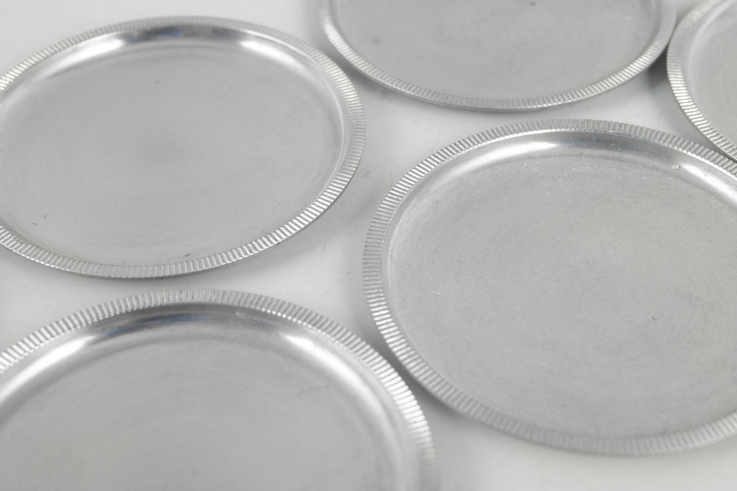 Just Andersen, set of eight coasters in pewter.Set of eight coasters in pewter with a fluted rim and a simple art deco design. Model 2634.