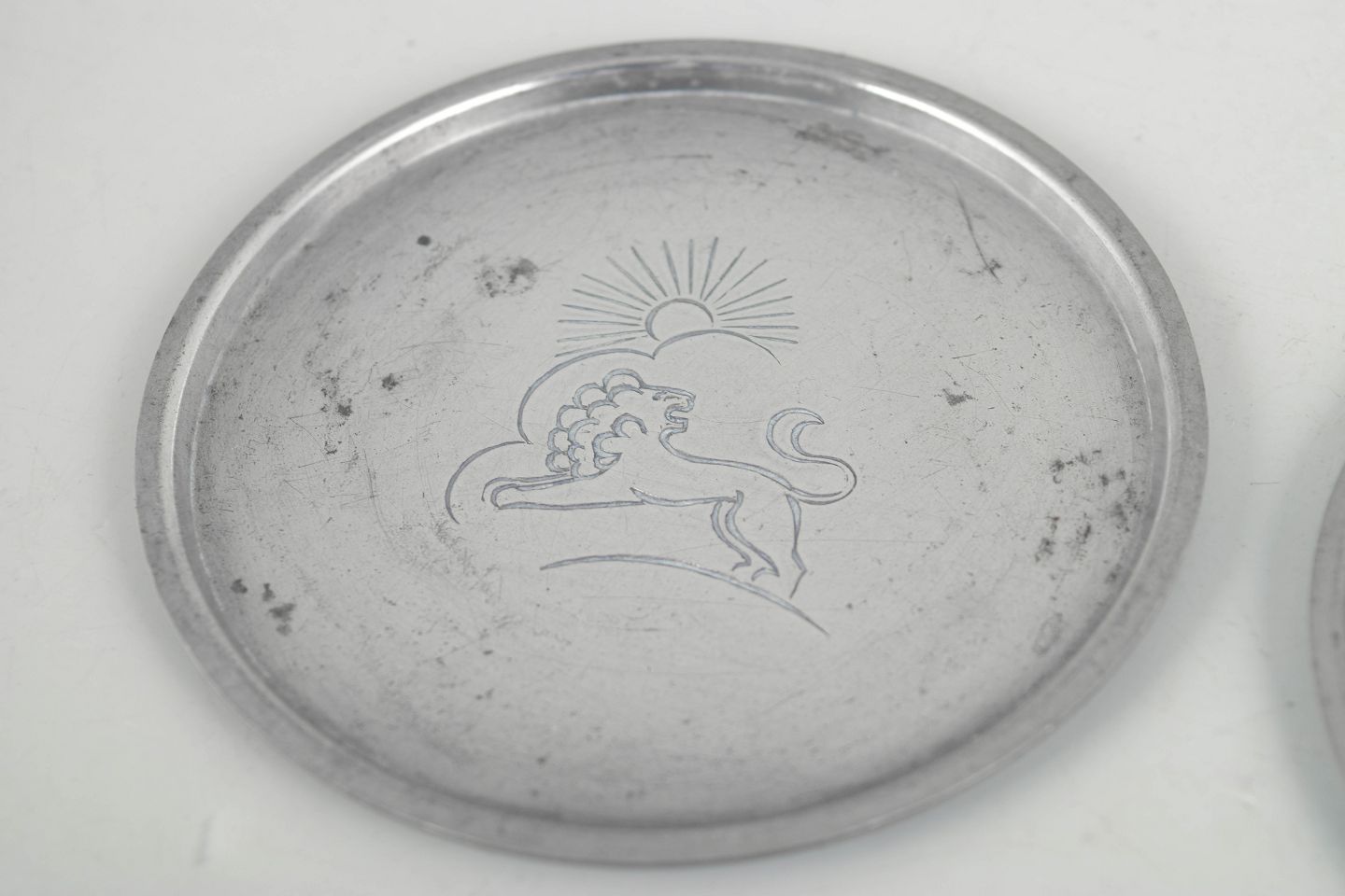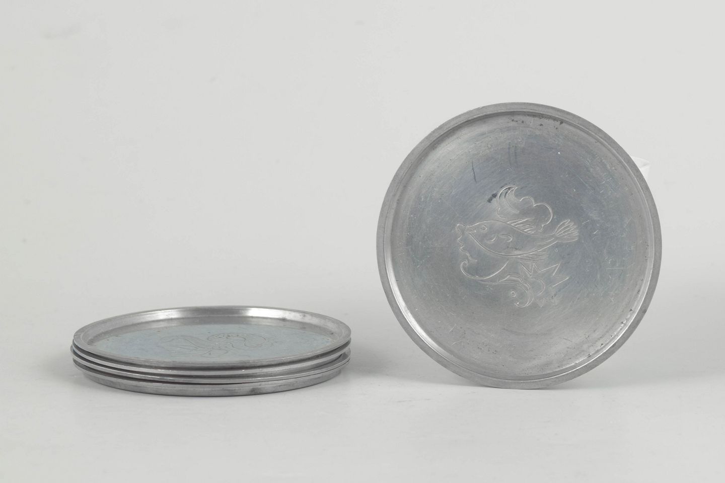 Just Andersen, set of five coasters in pewter.Set of five coasters in pewter with engraved animal motifs in a stylised art deco design. Model 1176.