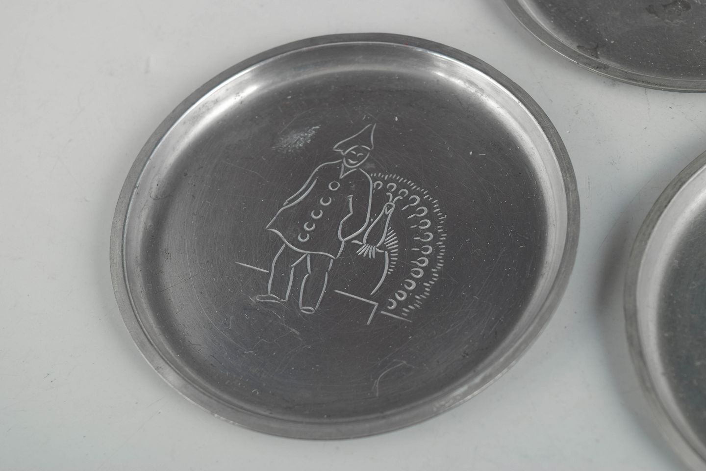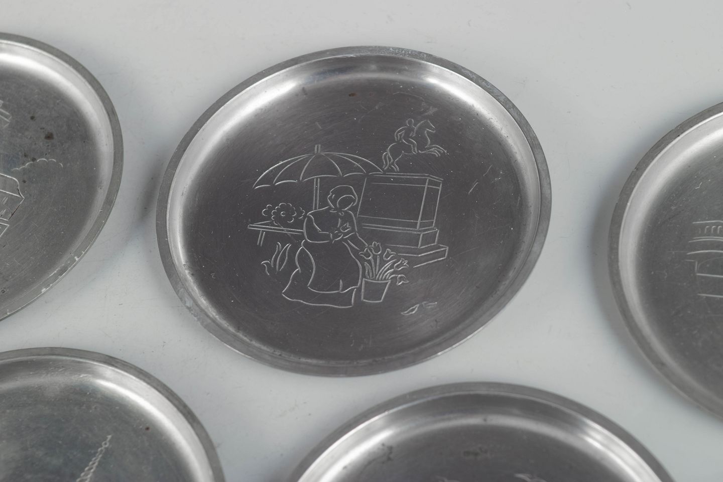 Just Andersen, set of six coasters in pewter with Copenhagen motifs.Set of six coasters in pewter with engraved Copenhagen motifs in a decorative art deco design. Model 2387.