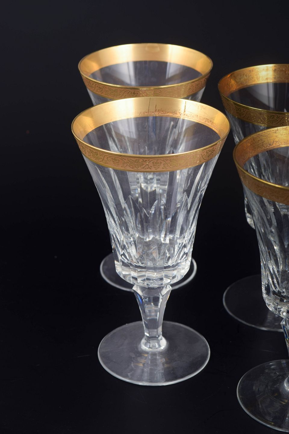 Artemisia, set of five red wine glasses.Elegant red wine glasses in cut crystal with 24 carat gold decoration along the rim, executed in a classic mid 20th century style.