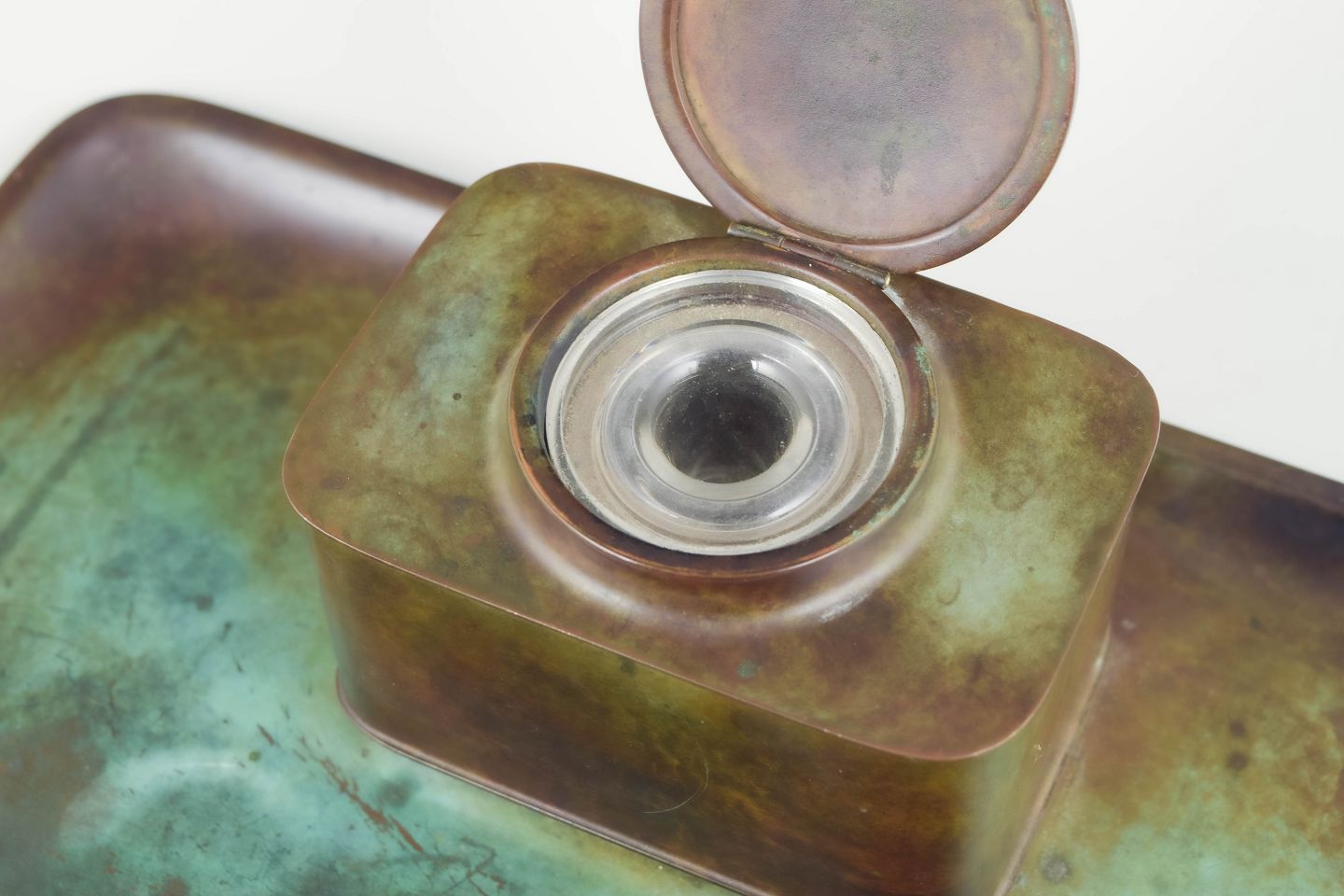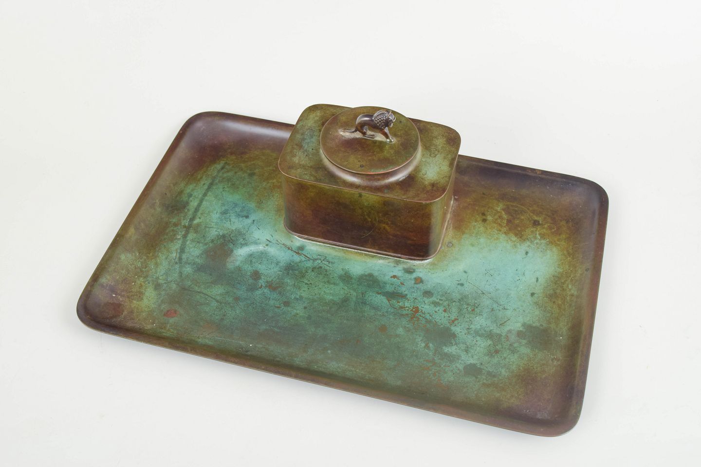 Just Andersen, art deco ink well.Ink well in alloyed bronze with a rectangular tray, square container with lid, and original glass insert. Model LB 1820.