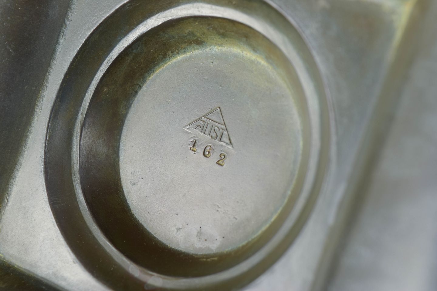 Just Andersen, ink well model 162 in art deco style.Ink well in "disko metal" with square tray and original glass insert, topped with a ribbed lid in classic art deco design.